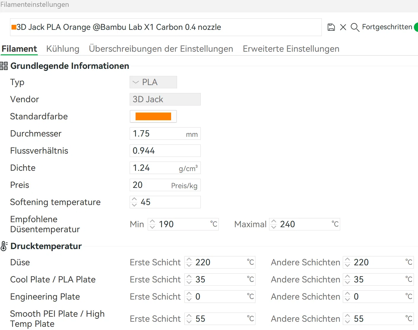 Bộ filament settings Eco PLA 3D Jake 1.75mm đã calibrate cho Bambu Studio trên Bambu Lab X1C với nozzle hardened steel 0.4. Có file .zip gồm các màu Black/White/Frosted Grey/Red/Orange và sẽ cập nhật thêm.