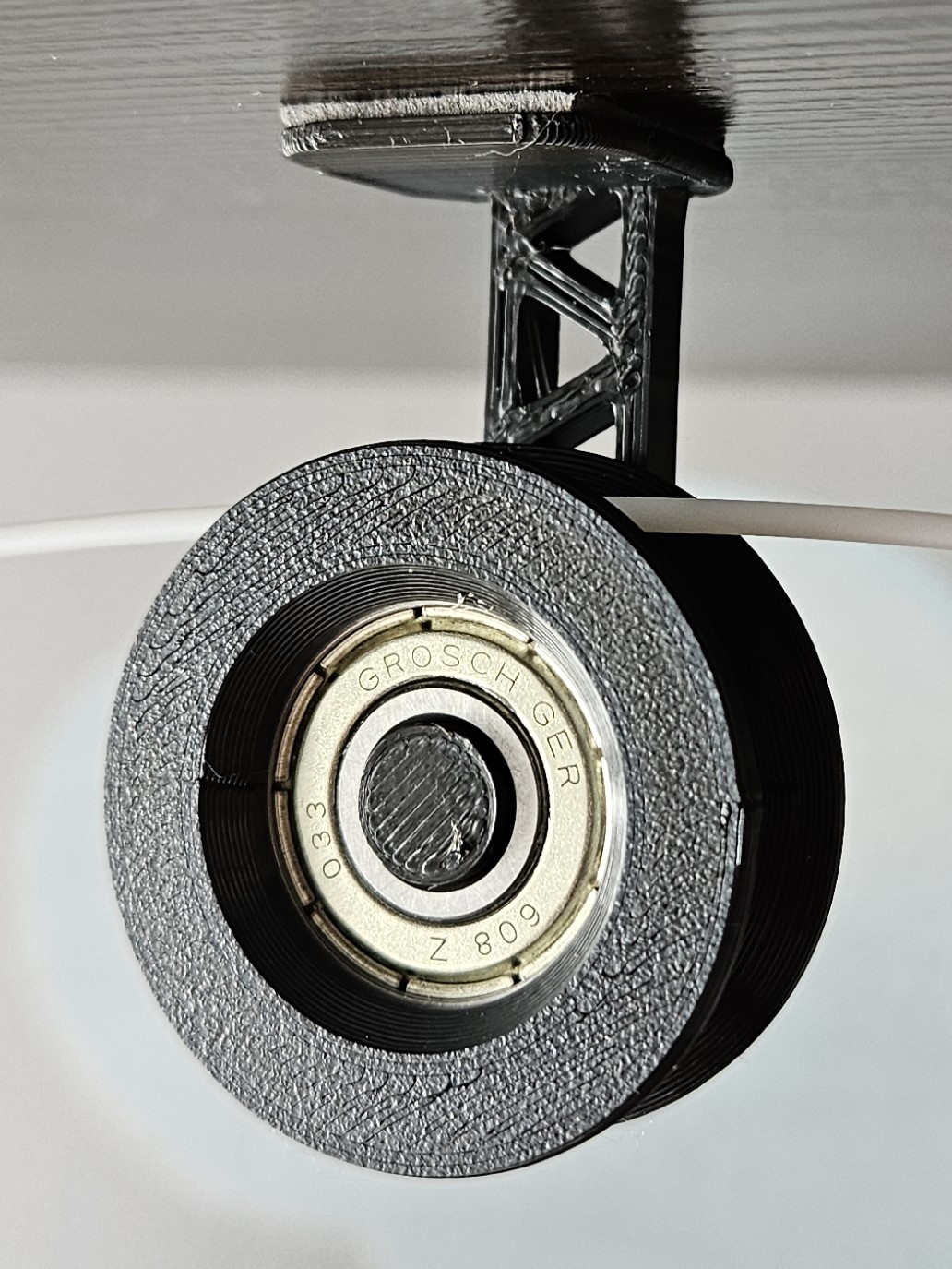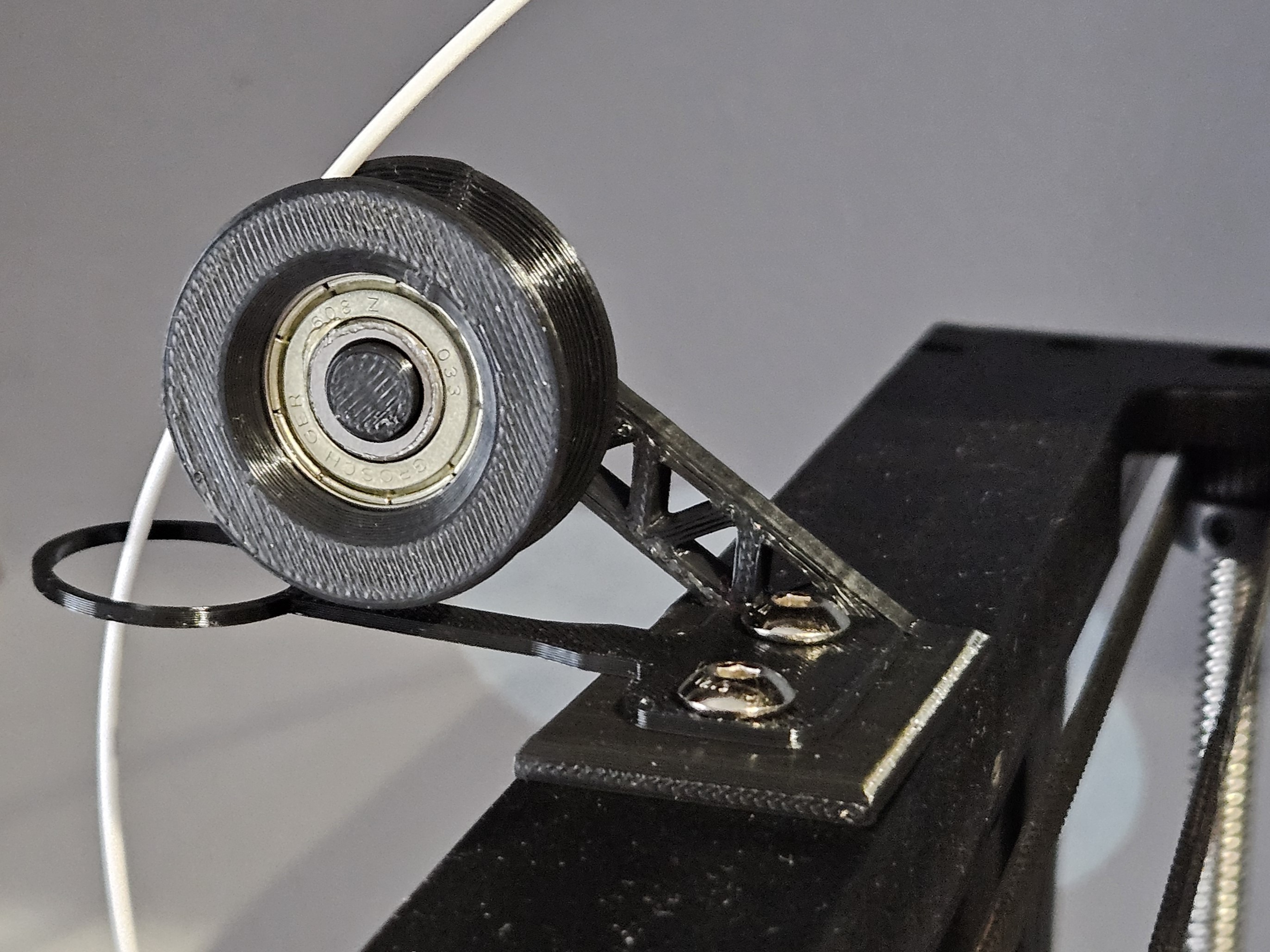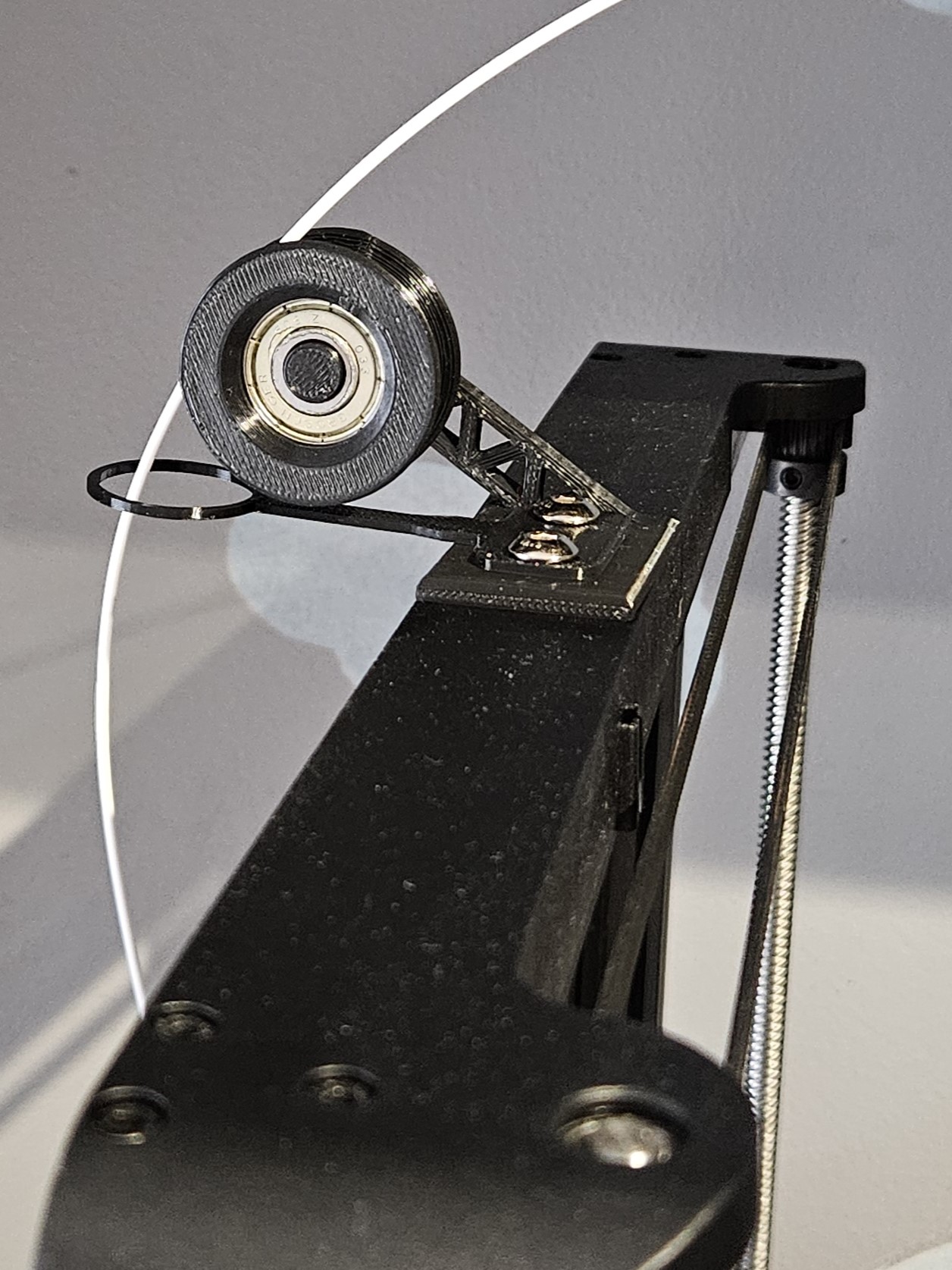 Một pulley dẫn filament đơn giản. Tất cả chi tiết được lắp ráp không cần phụ kiện thêm, chỉ cần filament và một vòng bi. Khung dẫn hướng thread là một món rời, nên bạn có thể tùy chỉnh cho hợp nhu cầu cụ thể của mình.
