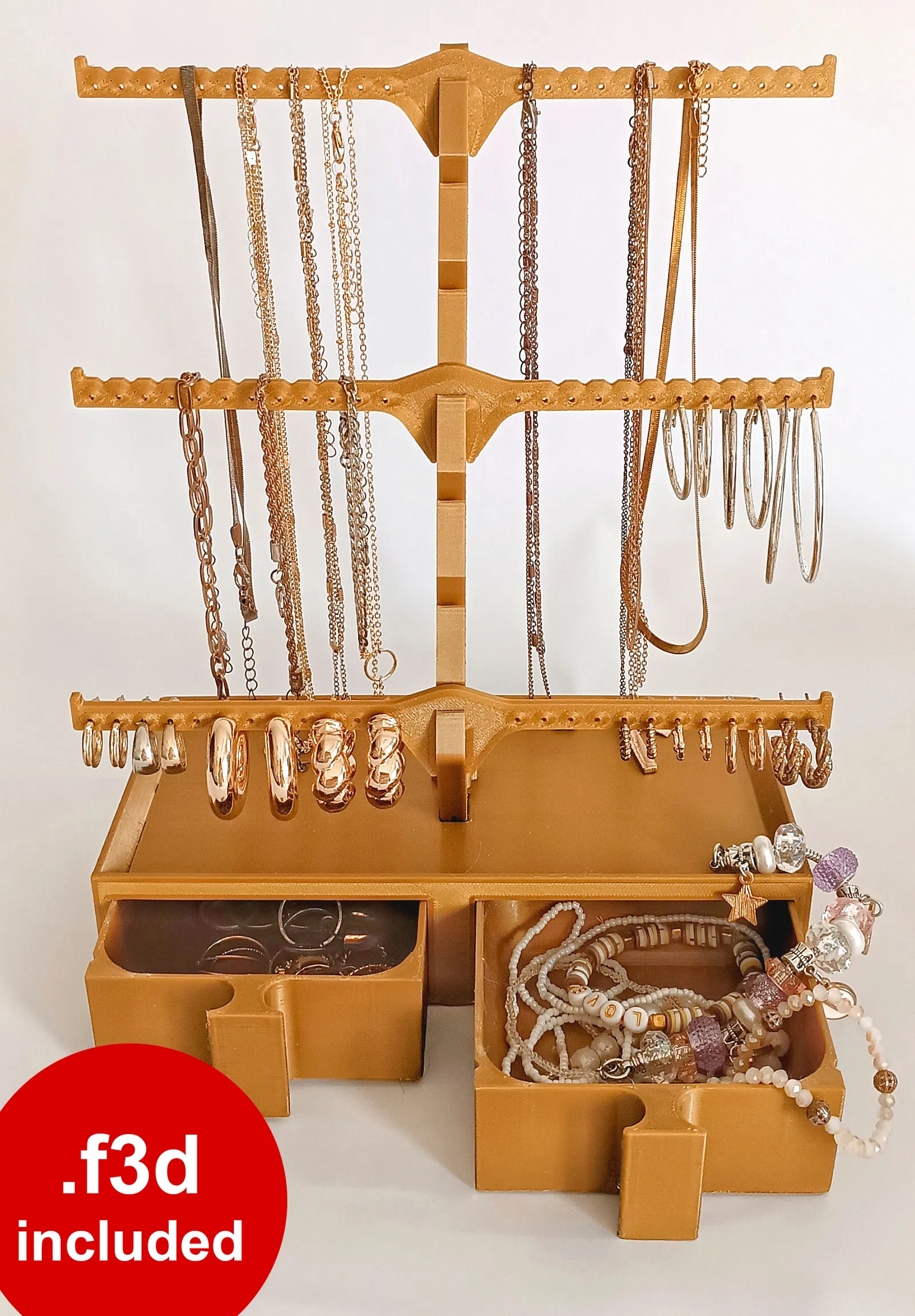 Một mẫu Jewelry Organizer đơn giản để sắp xếp trang sức gọn gàng, phù hợp cho nhẫn và vòng tay. In 3D xong là có chỗ để đồ ngay, giúp bàn trang điểm/ngăn kéo đỡ lộn xộn hơn.