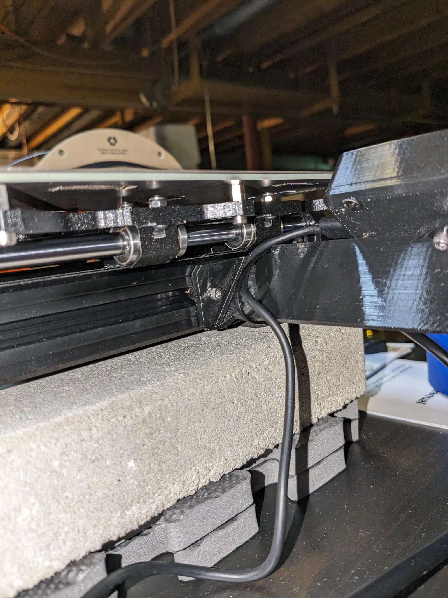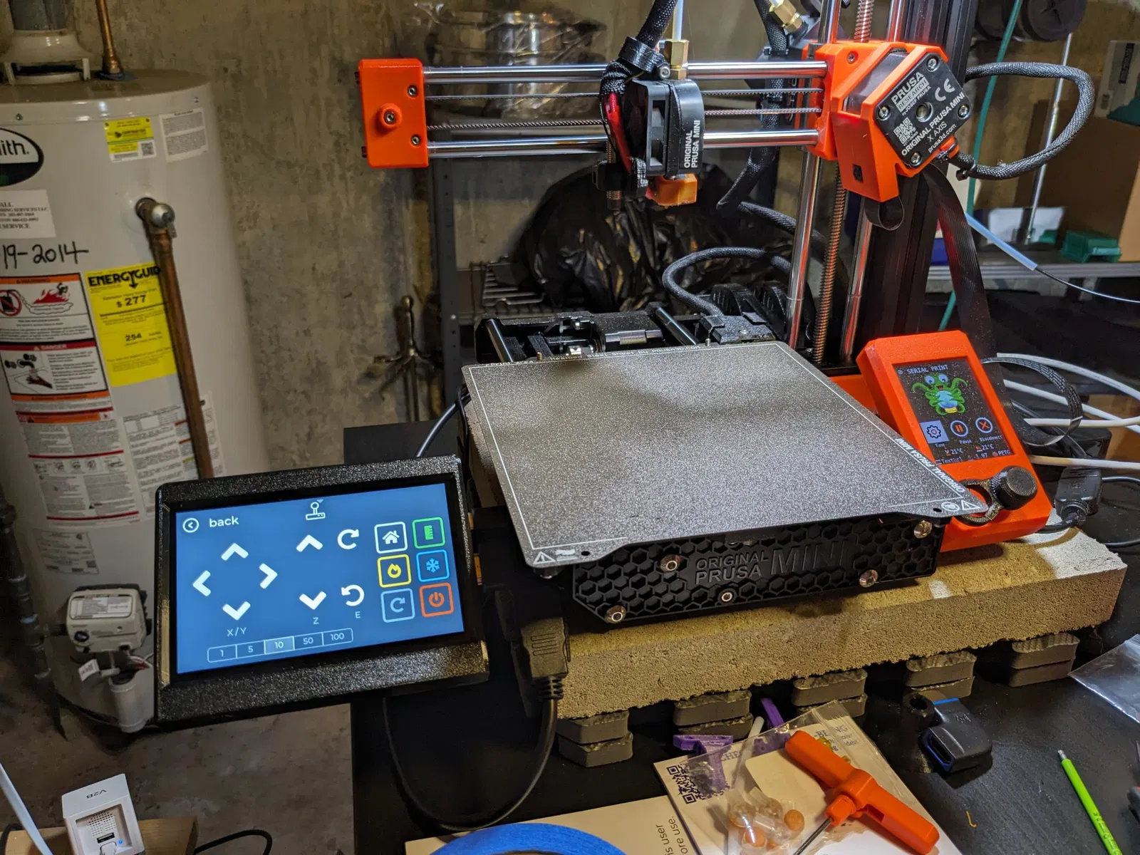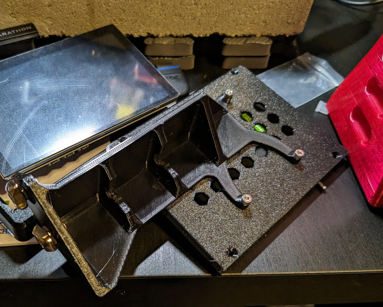 Tôi đã cố gắng làm cho cái này ổn định nhất có thể để màn hình ngồi hơi thấp hơn so với đáy của máy in. Máy in sẽ phải được nâng lên khỏi bề mặt mà nó đang đặt hoặc màn hình cần phải treo ra khỏi mép của bề mặt.