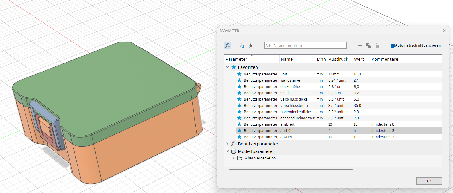Tất cả kích thước quan trọng đều dựa trên đơn vị 10 mm. Ví dụ, một hộp 100 x 100 x 40 có thể tạo bằng các tham số sau. Vui lòng xem hình trong phần tiếng Đức.