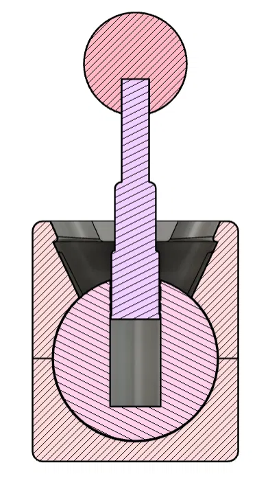 Nhớ chà nhám (sandpaper) quả cầu lớn cho mịn, không thì nó sẽ không trượt/di chuyển mượt. Sau đó đặt lò xo vào trong. Tiếp theo bạn có thể lắp cần gạt vào. Bạn sẽ nghe vài tiếng “tách tách” nhỏ. Sau đó đặt cụm quả cầu + cần gạt vào nửa dưới của hộp và đậy lại bằng nửa còn lại. Về lý thuyết thì không cần keo vẫn giữ được, nhưng nếu thật sự cần thì bạn có thể dán hai nửa hộp lại với nhau. Cuối cùng, trượt quả cầu nhỏ vào đầu còn lại của cần gạt. Nếu cần thì cũng có thể dán phần này.