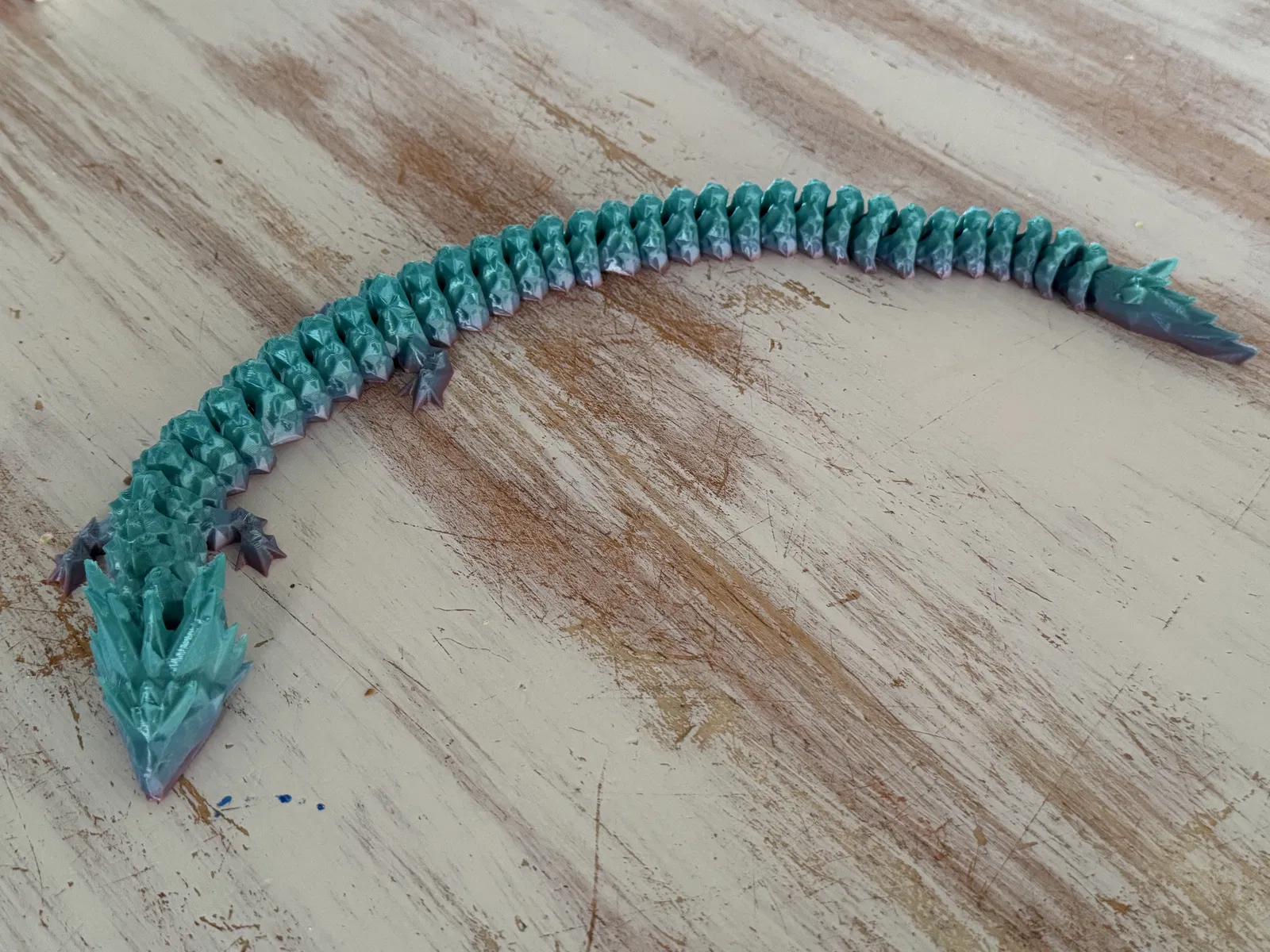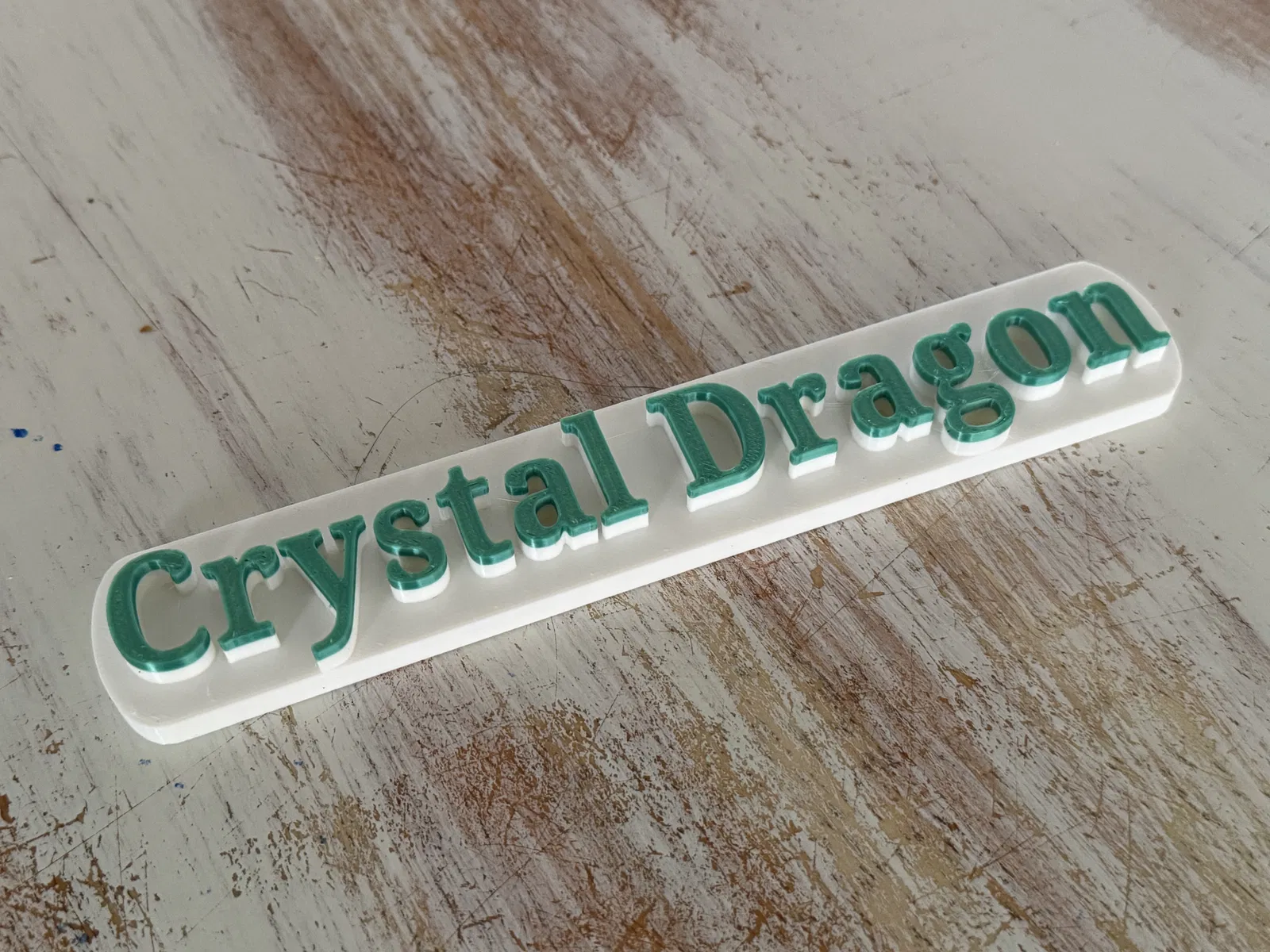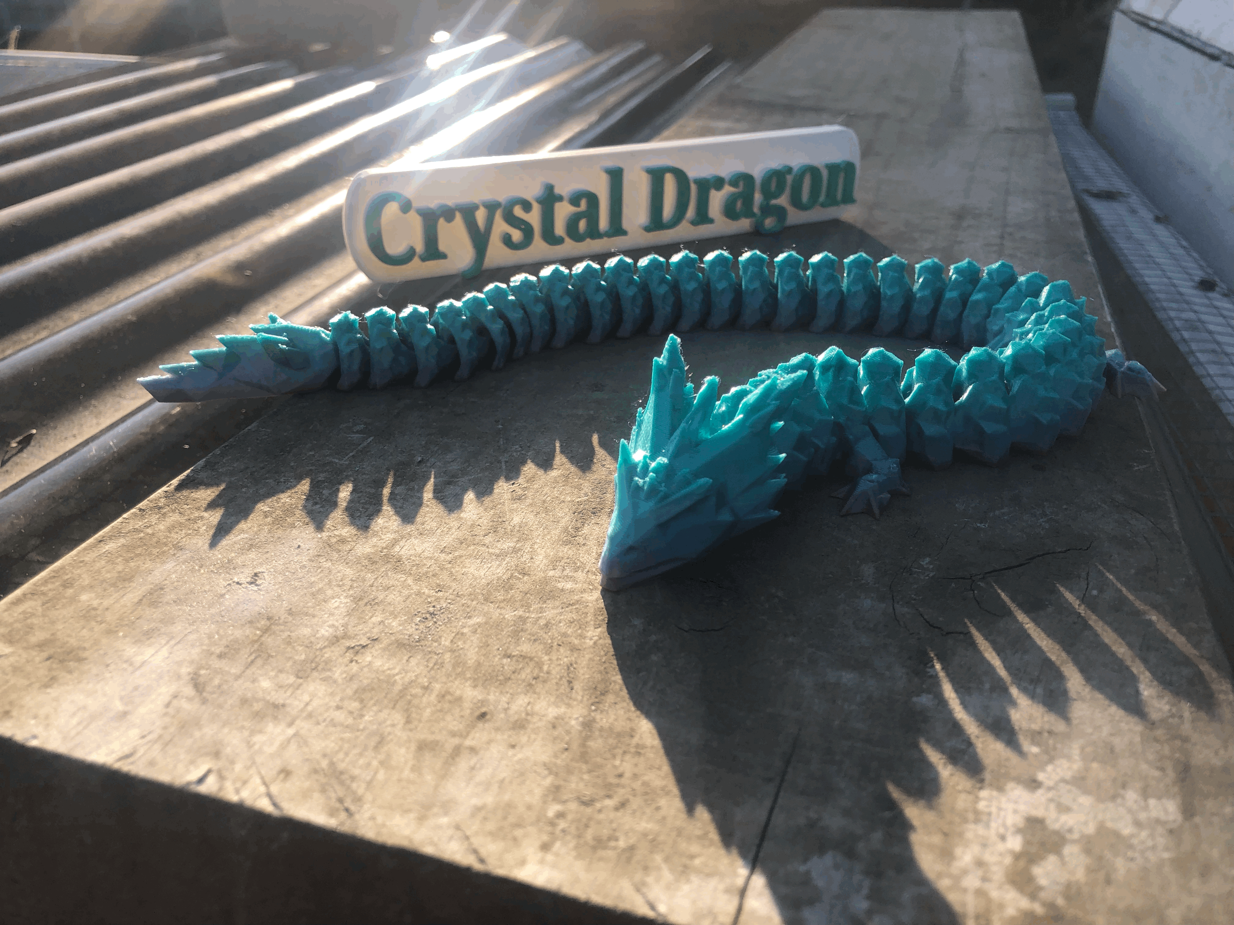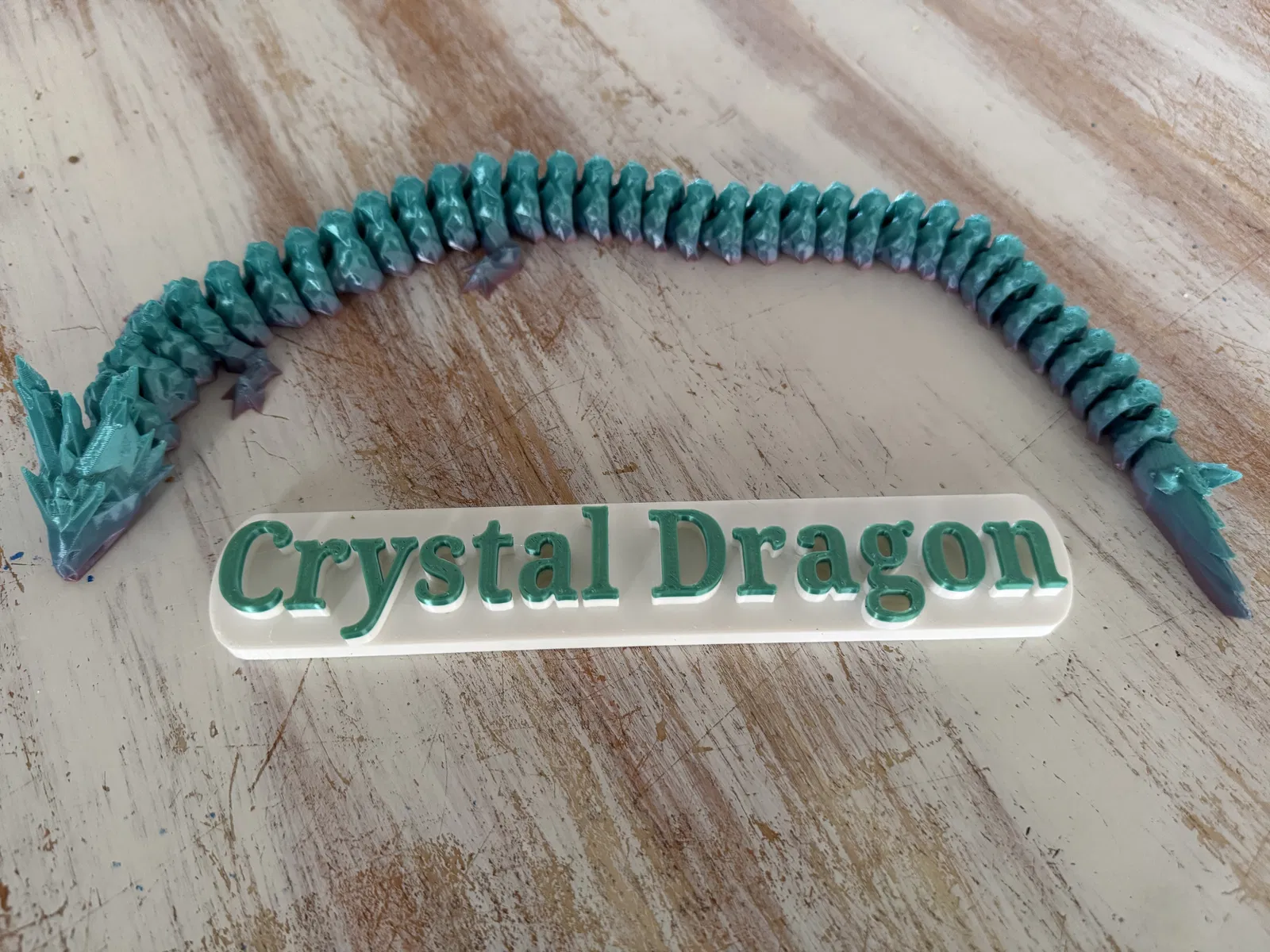 Mẫu rồng pha lê mình remix và thêm bảng tên để làm con rồng nổi bật hơn. In tốt với PLA ở tốc độ 100; không khuyến nghị PETG vì in lâu và có thể kém dẻo. Có thể dùng rainbow filament mua trên Amazon.