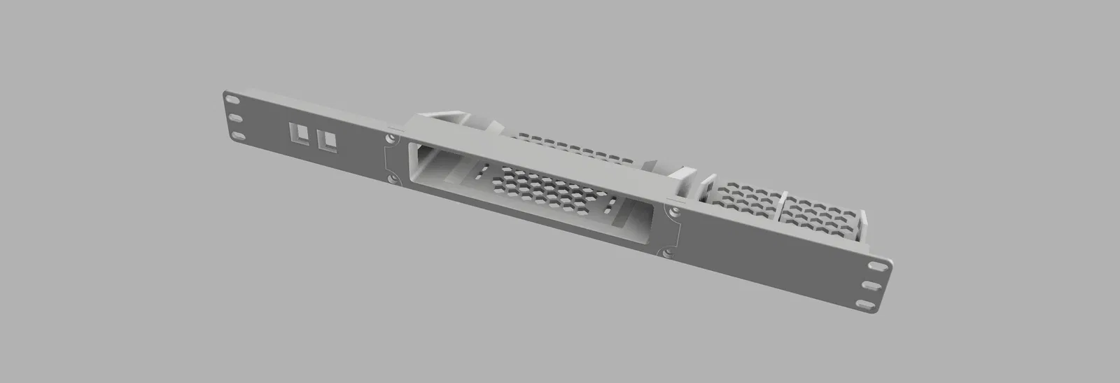 Giá rack 19" cho Mini HP ProDesk/EliteDesk G1–G6, có 2 keystone jack và chỗ gắn power brick. Phần giữa cần support trên build plate; lắp ráp bằng vít máy M4 và ê-cu sau khi in.