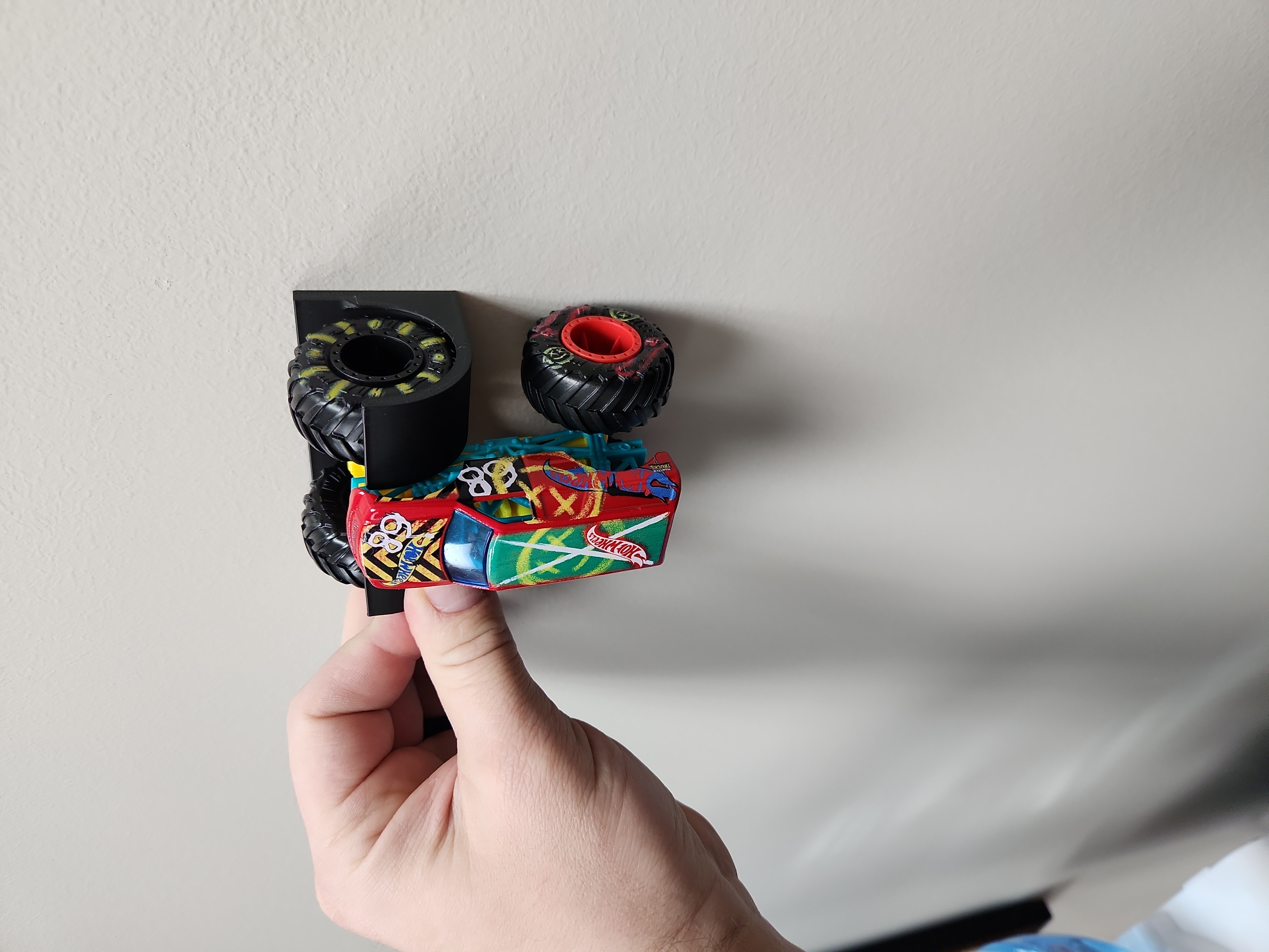 Hệ thống lưu trữ treo cho xe Hot Wheels Monster Truck. Các hanger được dán lên tường bằng miếng dán 3M Command cỡ Medium (ghi là 2.8"). Cái jig có sẵn chỗ gắn thước thủy (spirit level) dạng ống bubble kích thước 9.5x40mm. Jig sẽ canh khoảng cách theo chiều dọc và chiều ngang, đồng thời cũng làm được kiểu xếp chéo nếu bạn lệch vị trí một trong các hanger.