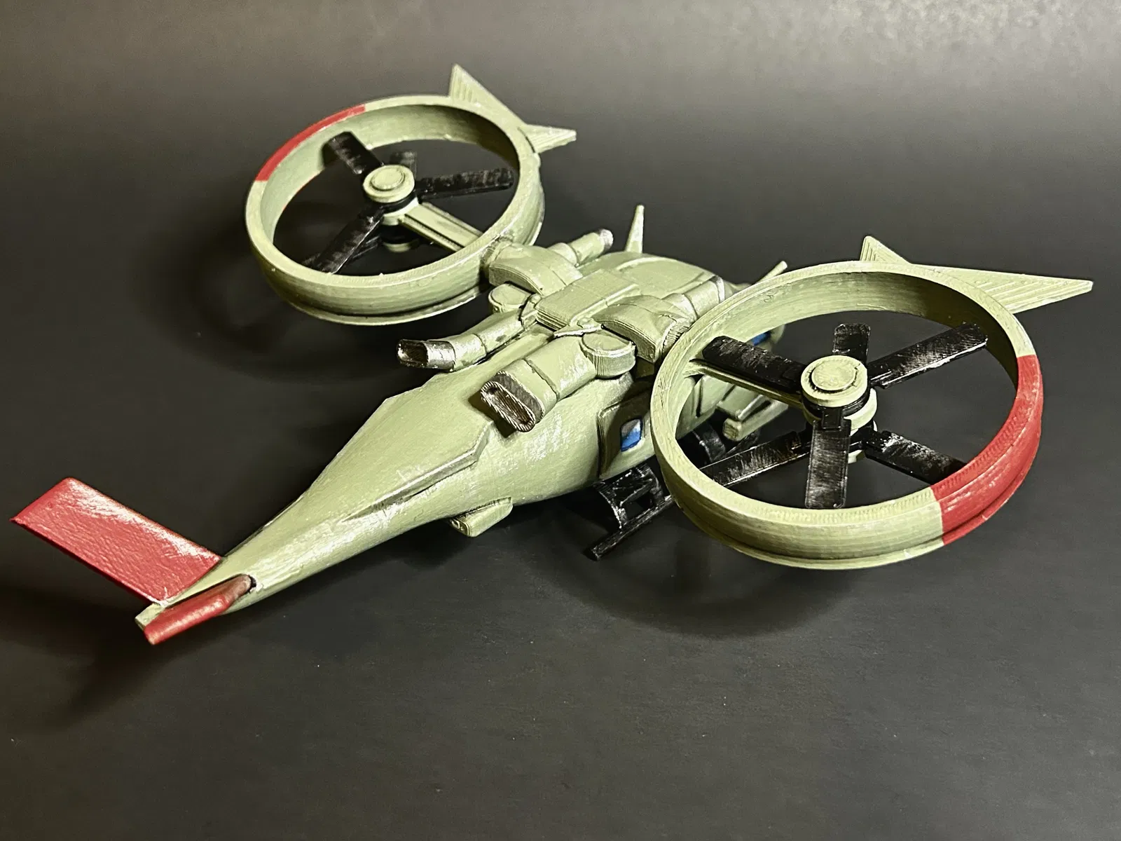 NOTE: Mình rất khuyên bạn ĐỪNG lắp theo thứ tự này! Nếu bạn muốn sơn, thì trước tiên hãy gắn các rotor (chưa ráp hoàn chỉnh) vào thân. Xong xuôi thì cứ sơn toàn bộ mẫu, nhưng giữ propellers riêng ra. Khi sơn xong hết rồi, LÚC ĐÓ mới hoàn thiện phần lắp ráp. Hy vọng mình nói rõ ràng đủ.