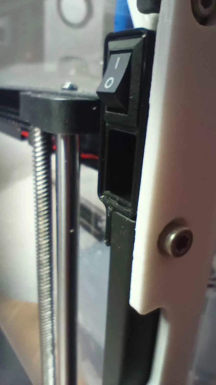 Mình cần cách để bật/tắt thanh đèn LED nên làm cái hộp này, gắn lên thanh ray khung bên phải phía trước, dùng cho rocker switch kích thước 8.5mm x 13.5mm. Dùng 1 con bolt M4x12mm và 1 đai ốc M4.