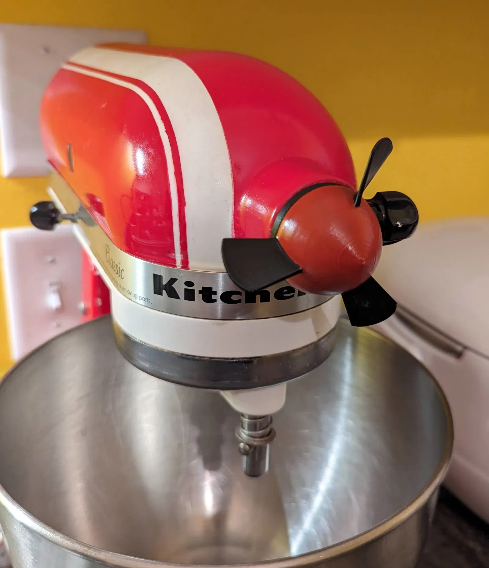 Phụ kiện cánh quạt quay cho Kitchen-Aid mixer. Dùng ốc M3 dài 8–16mm, siết vừa để không rung kêu nhưng vẫn quay. Lưu ý: bản này không ăn khớp bánh răng nên không quay theo máy; có remix khác có hỗ trợ.