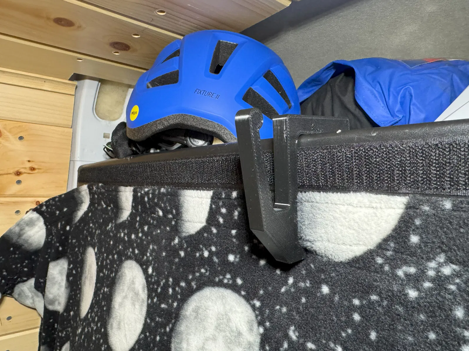 Tụi mình rất mê chiếc Promaster Van, nhưng lúc nào cũng muốn có thêm cách để treo đồ. Mình thiết kế mấy cái móc áo này để gắn lên cái kệ phía trên hai ghế trước.