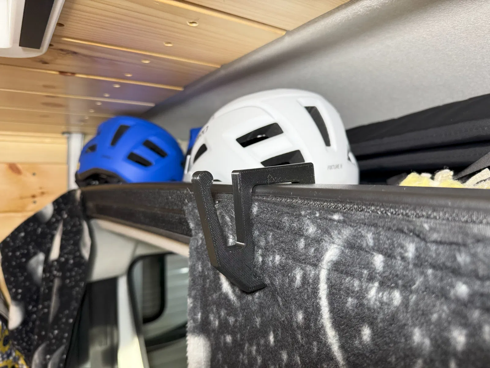 Bộ móc treo/coat hooks thiết kế để gắn vào kệ phía trên hàng ghế trước của RAM Promaster Van 2023, giúp treo đồ gọn gàng cho vanlife. Khuyến nghị in bằng PETG để bền và chịu lực.