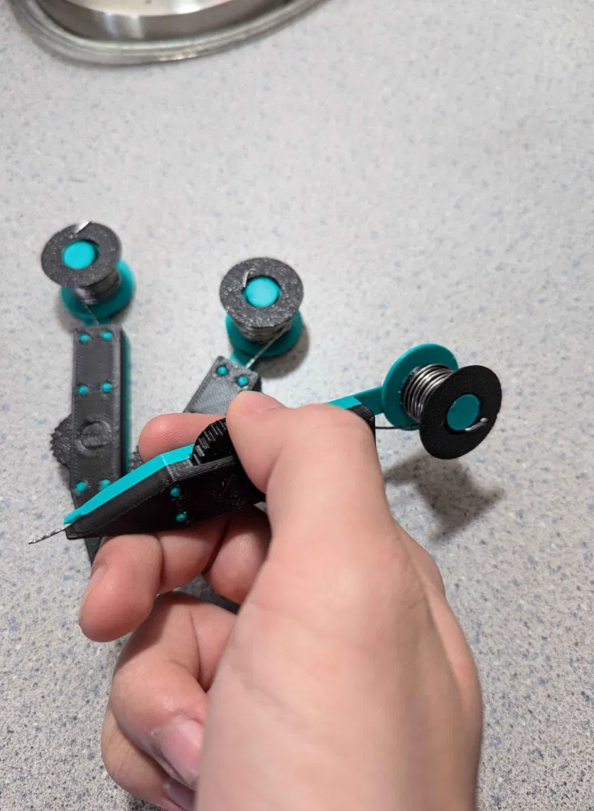 Solder Feeder đơn giản giúp cấp thiếc hàn tiện hơn. Bánh răng chạy hơi sượng nhưng đây là phiên bản hoàn thiện nhất tác giả làm được. Có bán bản làm sẵn trên Etsy dưới tên GlacierFrost.