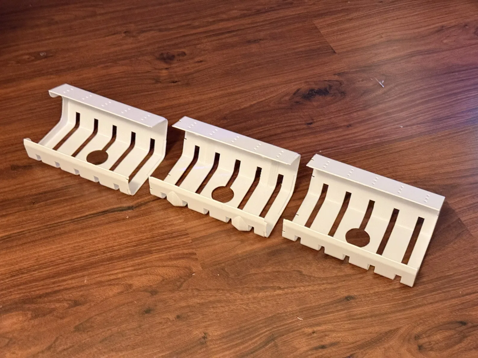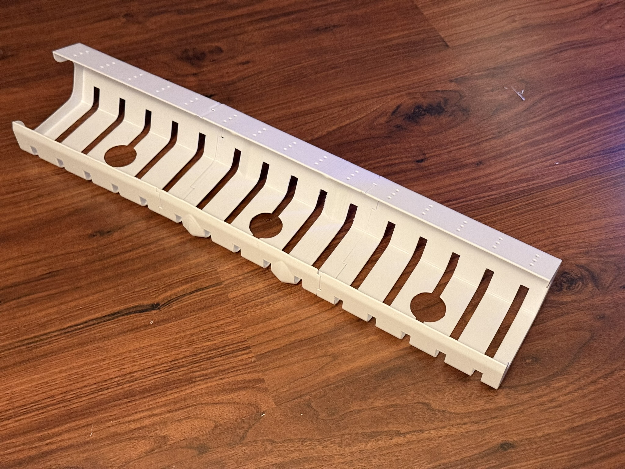 Bộ Under Table Cable Conduit Manager dạng module giúp giấu và gom dây gọn dưới mặt bàn. Bắt vít mặt dưới bàn (lỗ M4 có sẵn). In Left/Right, Middle tuỳ chọn để nối dài. Khuyến nghị nozzle 0.6mm HF, layer 0.4mm, PETG; cần support trừ vùng lỗ.