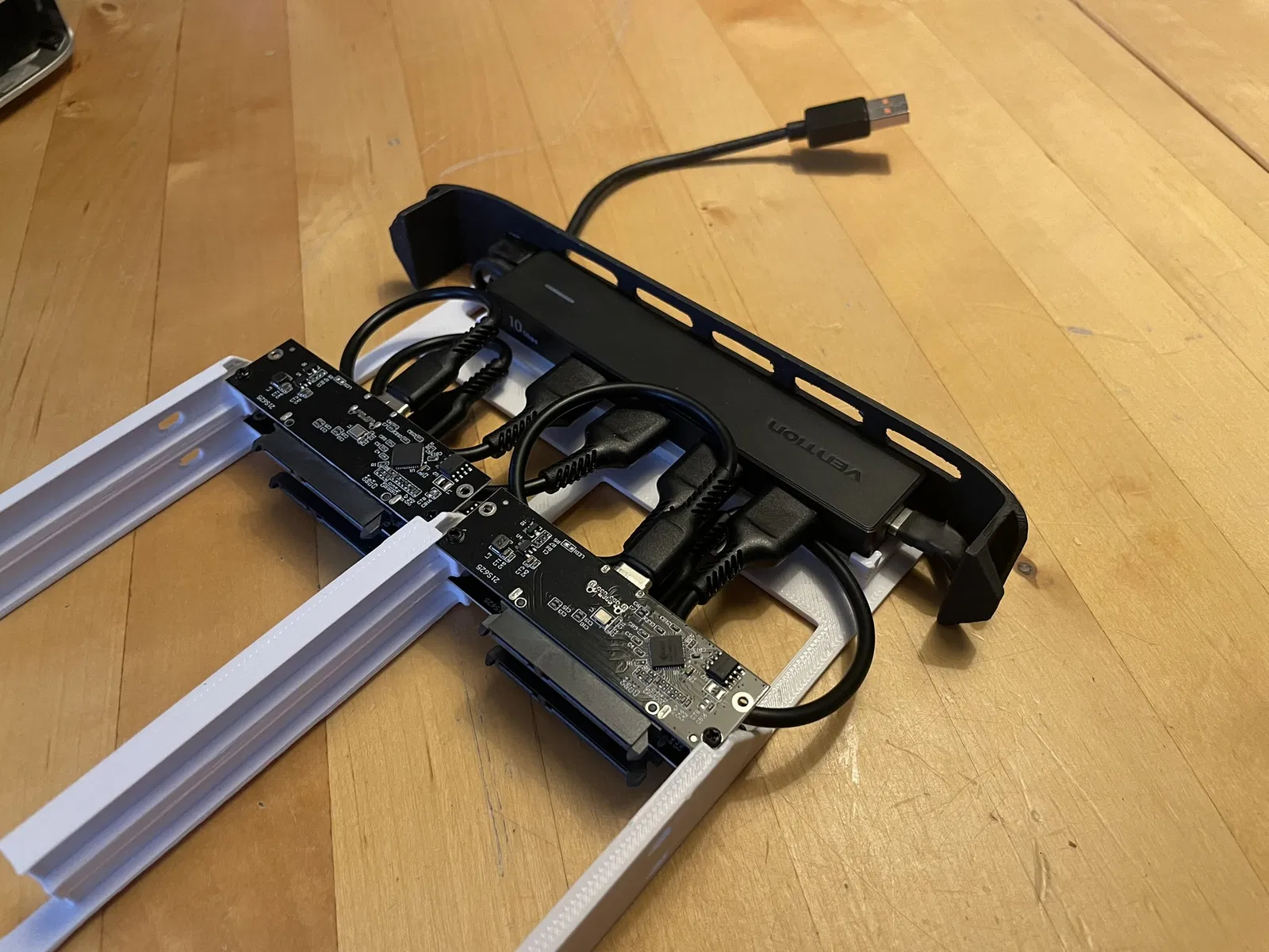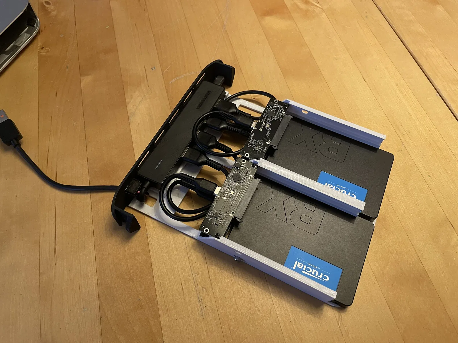 Vì bốn ổ SSD chắc sẽ ăn điện nhiều hơn mức một cổng USB-A cấp được, nên mình chọn dùng USB hub có nguồn (powered). Bạn có thể thử không cấp nguồn ngoài, nhưng dùng hub có nguồn thì đơn giản hơn.