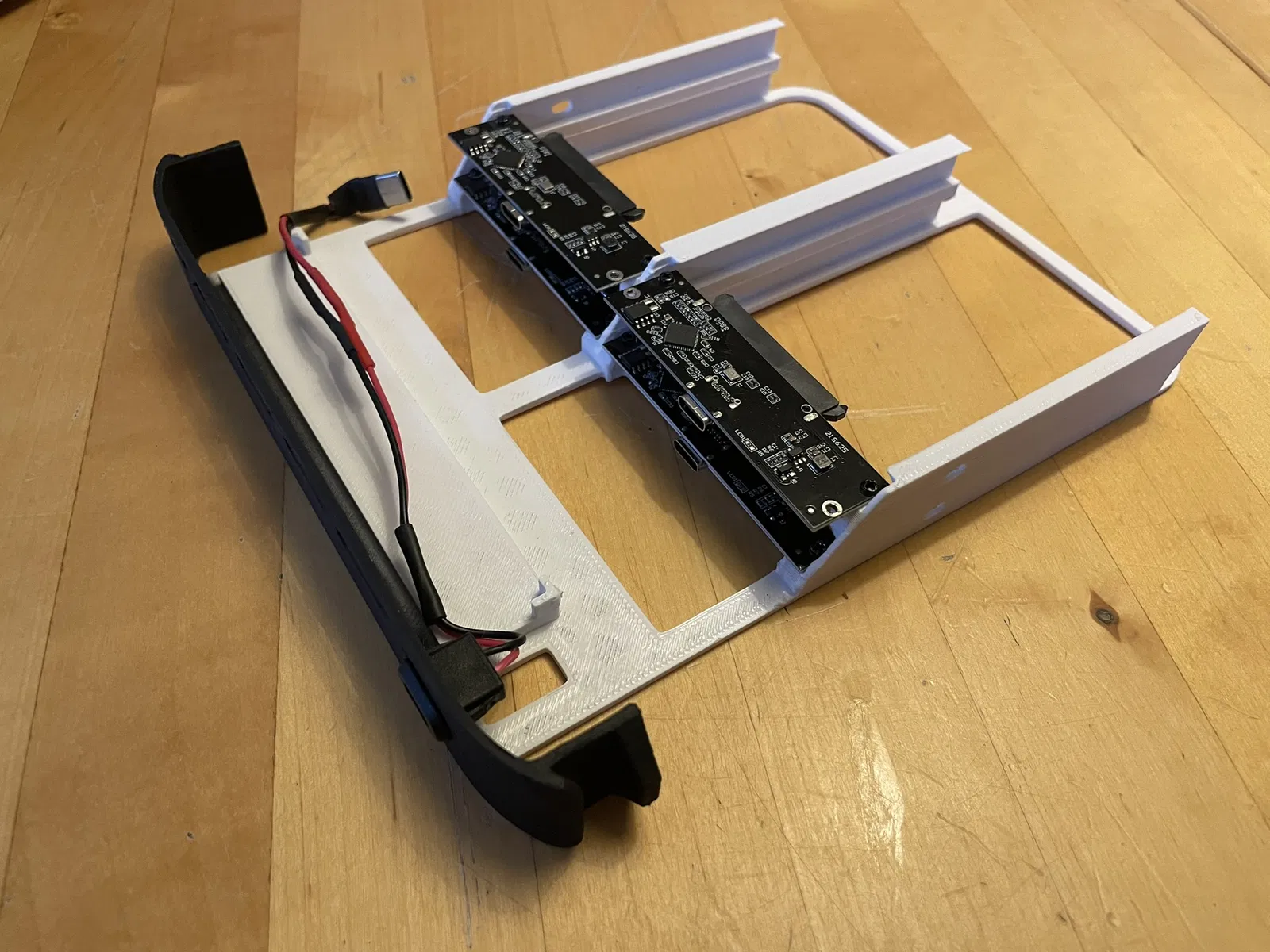 Gắn các board điện tử của SSD. Dùng ốc từ hộp SSD để bắt các board vào chi tiết in 3D. Các board này nằm chồng trực tiếp lên nhau và mỗi board dùng 2 con ốc. Lắp các board phía dưới trước, dùng các lỗ ở phía cổng USB connector. Các board phía trên cũng dùng 2 con ốc nhưng ở các lỗ phía SSD connector. Xem ảnh để rõ hơn.