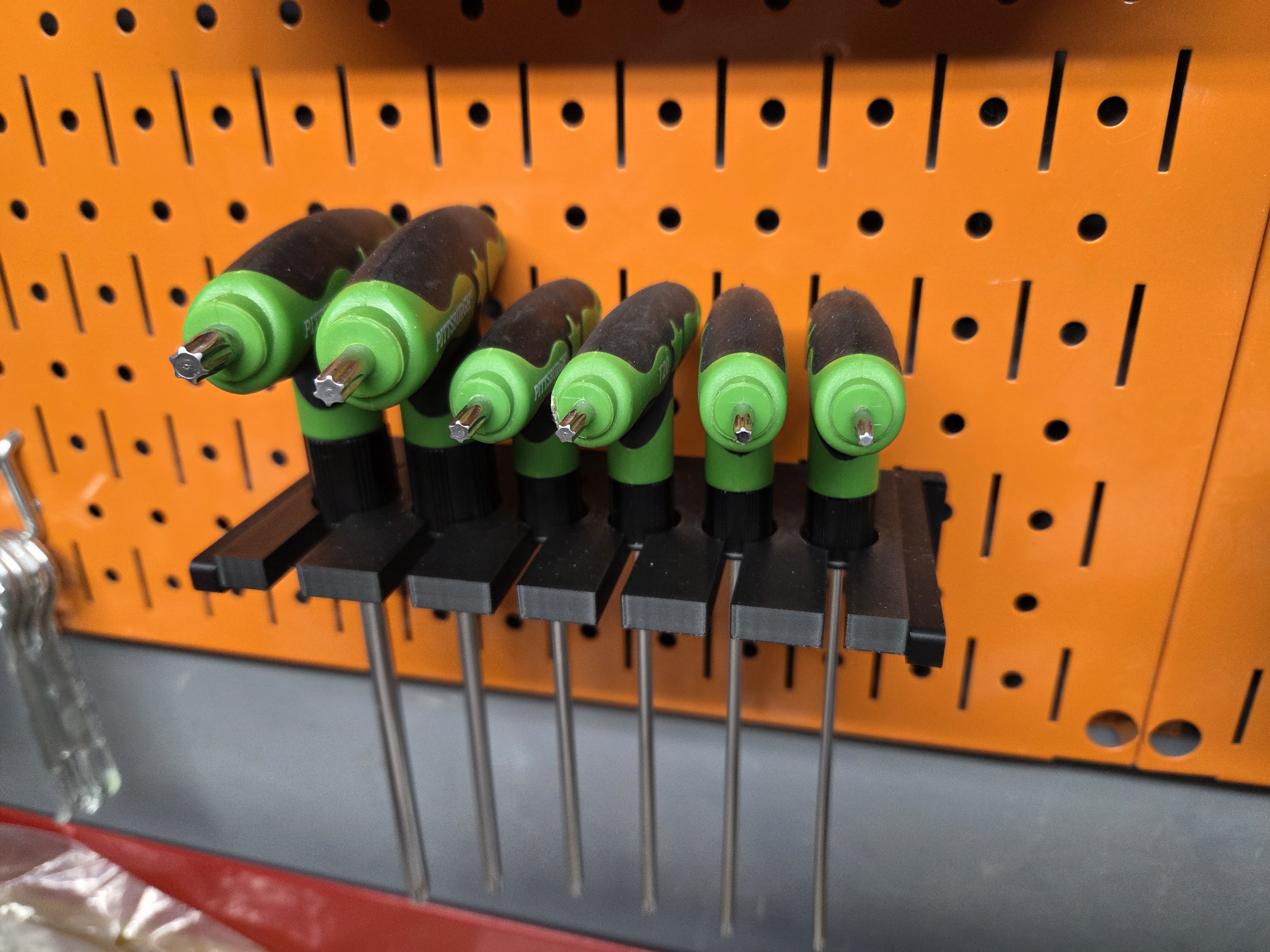 Kệ giữ bộ Pittsburgh T-Handle TORX Offset Hex Key Set (Harbor Freight) dùng hệ DDD Wall Control. Có phần hõm giữ đáy tay cầm chắc hơn, mặt trước có rãnh giúp thao tác dễ, gắn bằng 2x3 L Brackets.