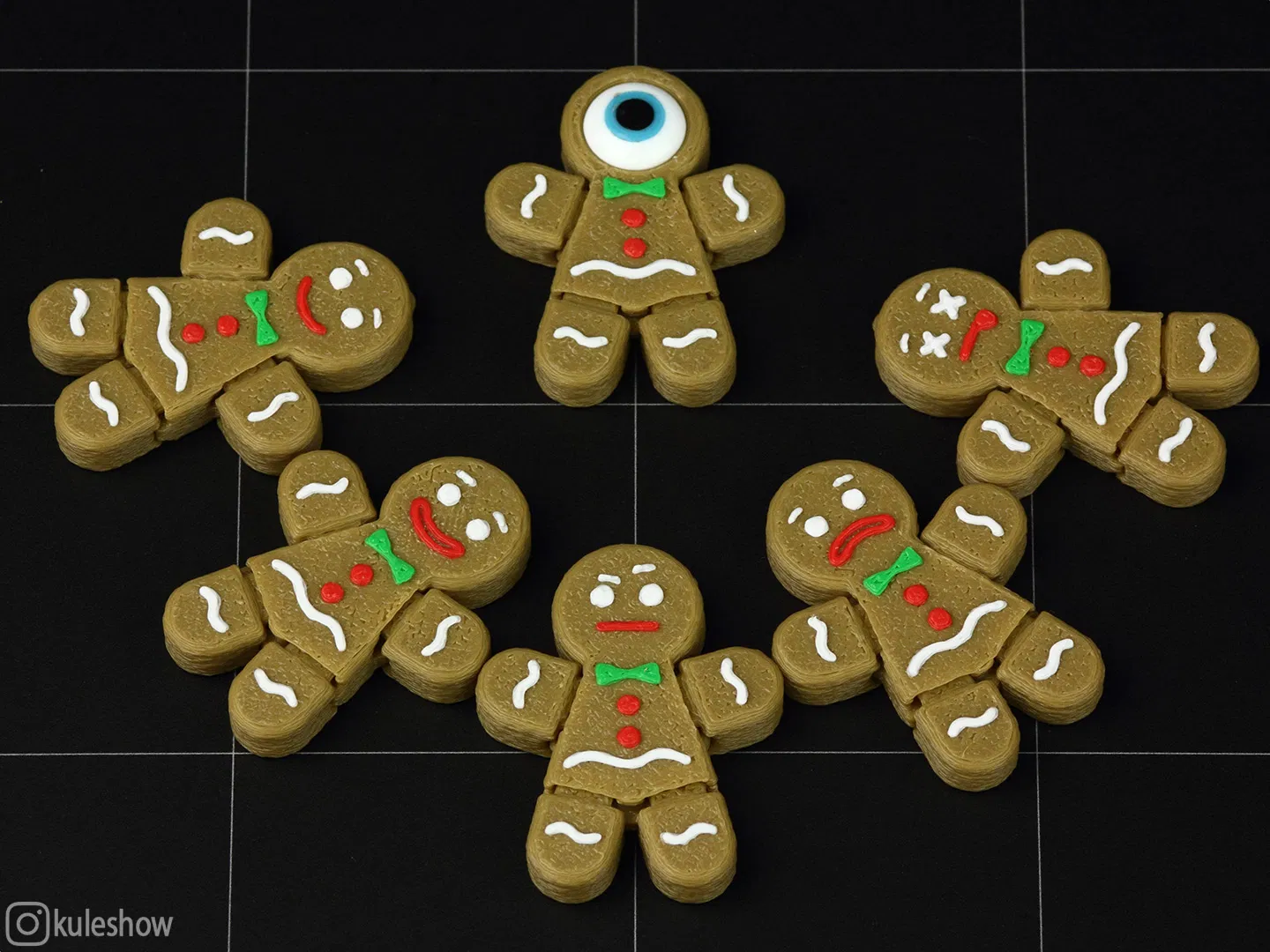 Mẫu Flexible Gingerbread man dạng articulated, dẻo tay chân, dùng làm móc khóa hoặc đồ treo cây thông Noel. In không cần support, có chỗ đặt 2 nam châm trụ 5x1mm. Gợi ý dùng fuzzy skin và Hilbert curve pattern.