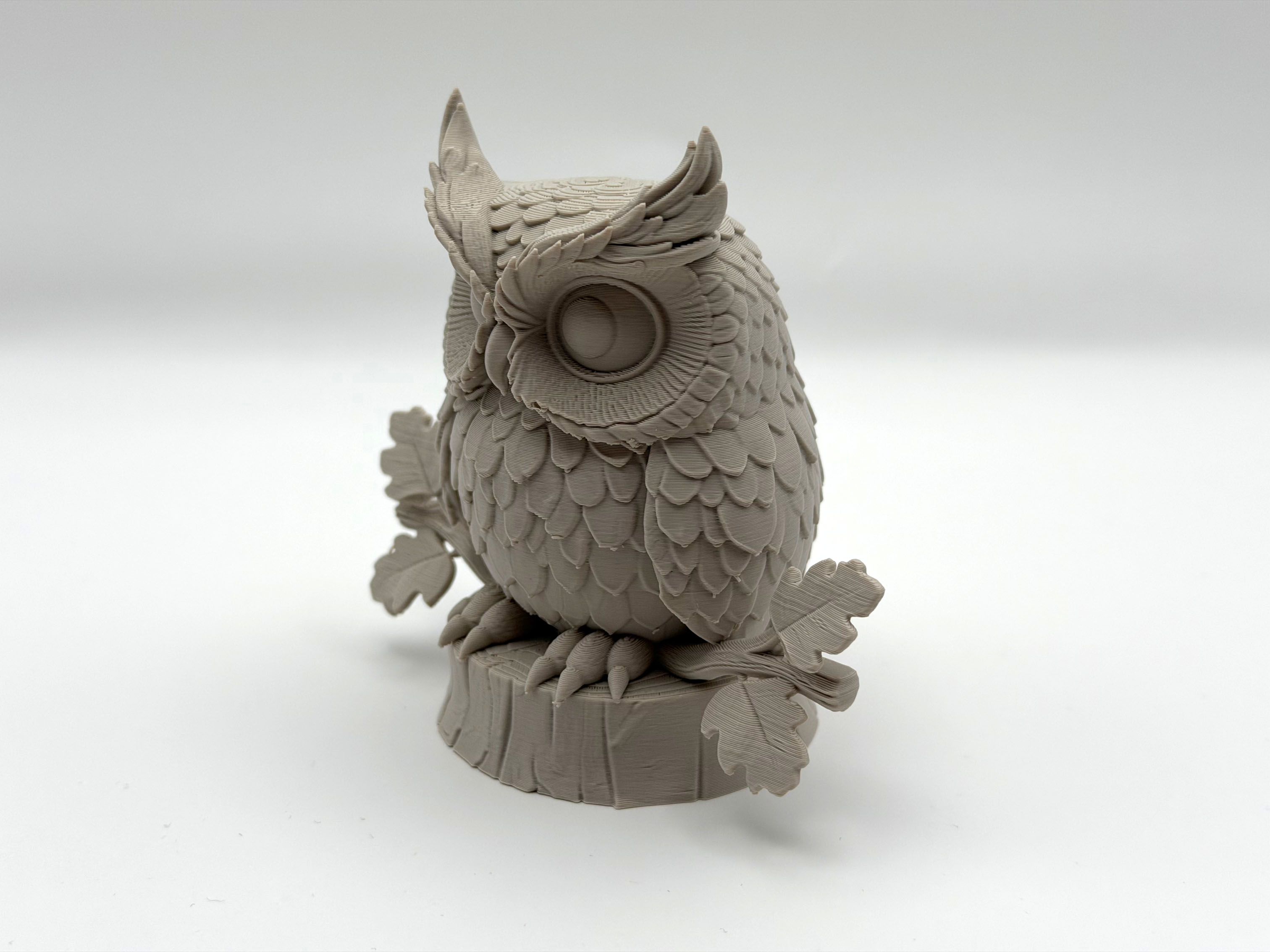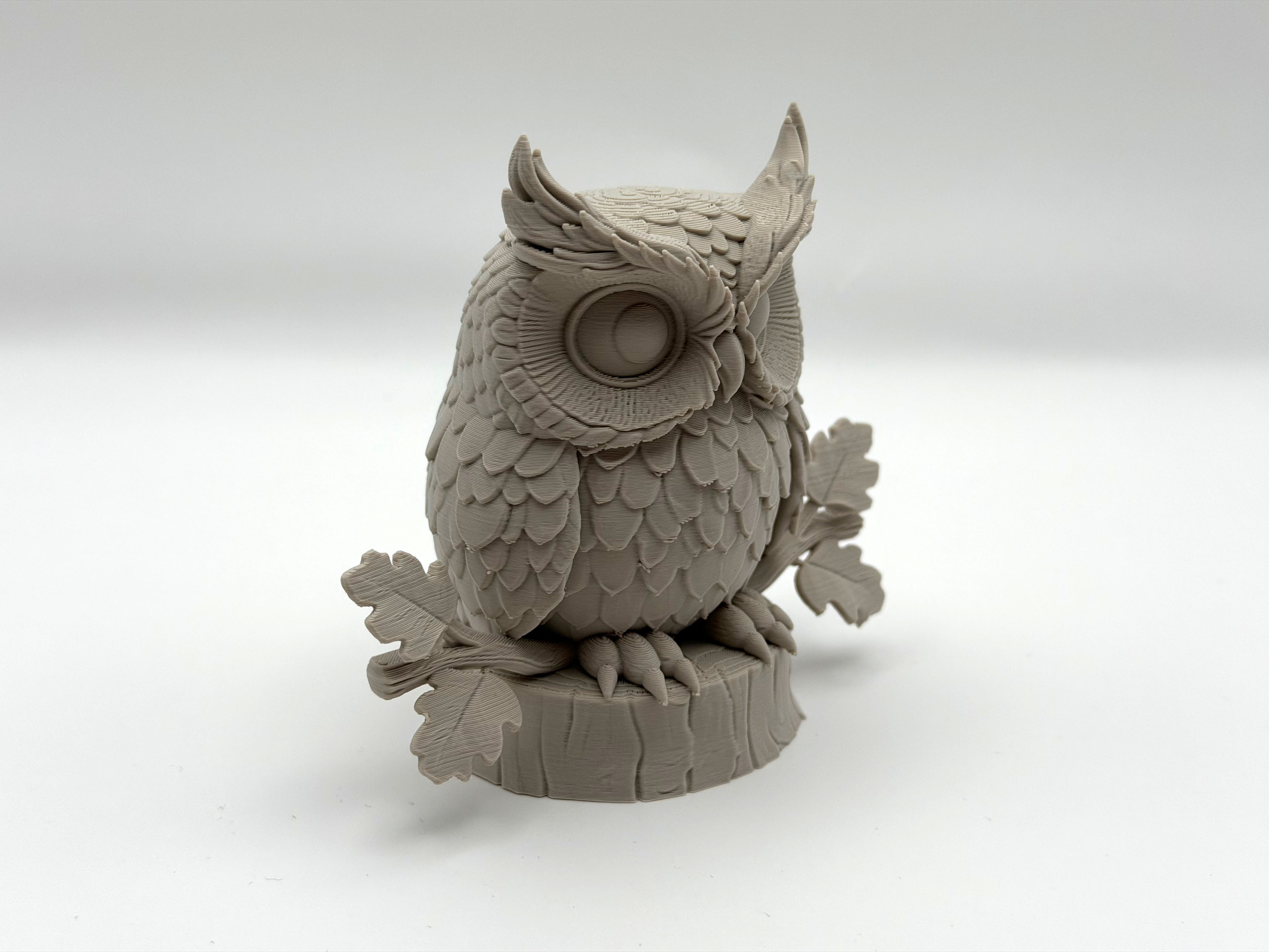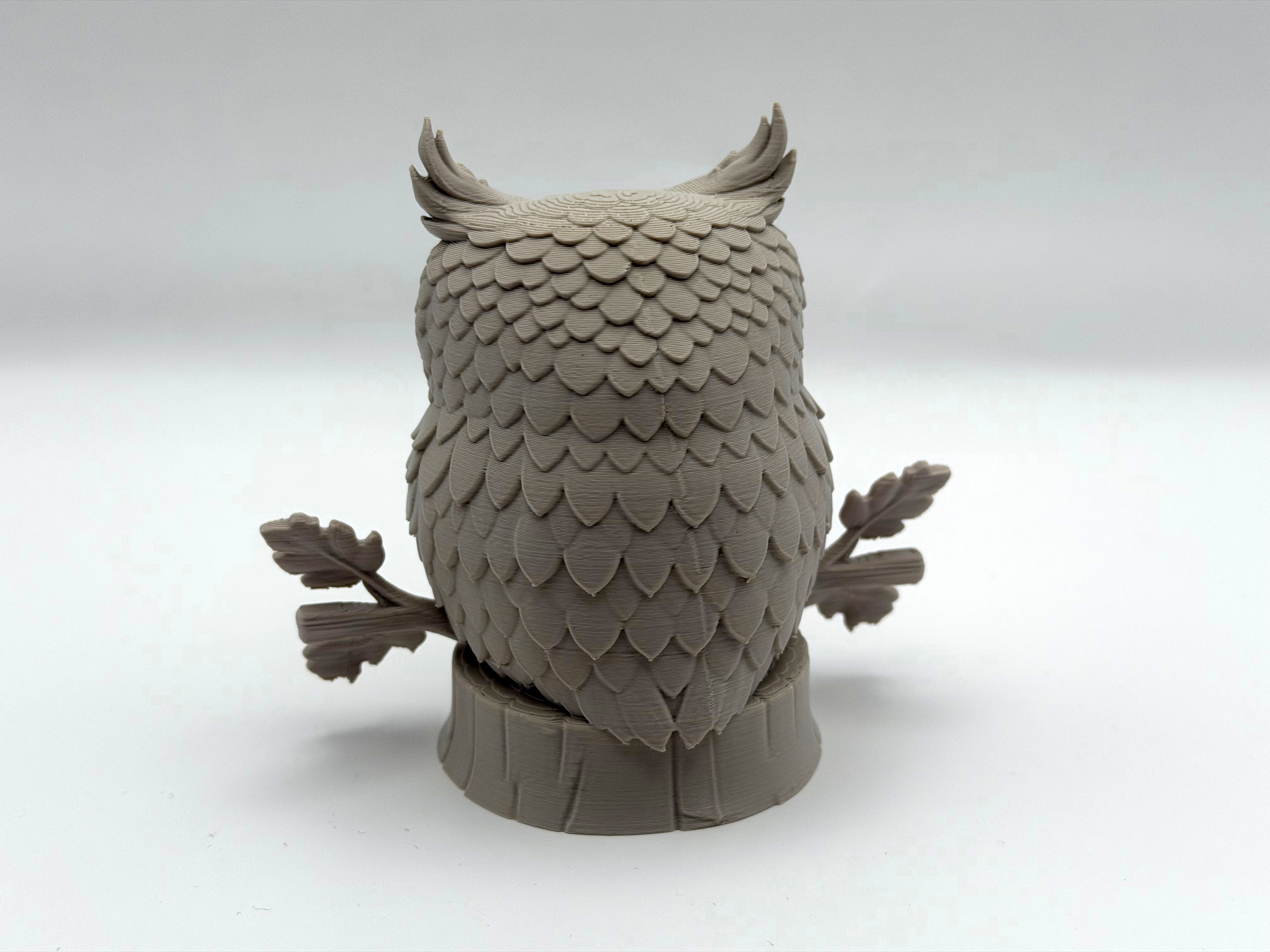 Mẫu **Owl on Branch** là tượng cú mèo đậu trên gốc/cành gỗ với chi tiết lông sắc nét và dáng cân đối, vừa hiện đại vừa huyền bí. In cần ít supports; dùng organic-style supports và chỉnh Z-top height để tháo dễ hơn.