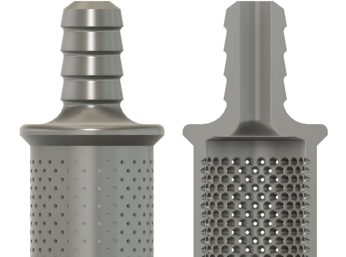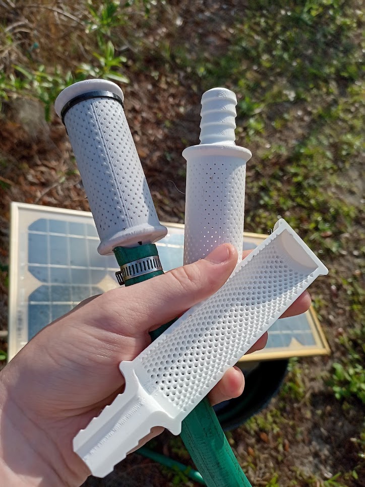 Thiết kế để dùng trong một giếng tưới (sprinkler well) bị bỏ hoang ở sân nhà, lưới lọc đầu hút (intake screen) này giúp chặn cặn bẩn và rác vụn không cho đi vào máy bơm và/hoặc hệ thống tưới. Kích thước lỗ là 1mm. Đường kính tổng thể khoảng 40mm.