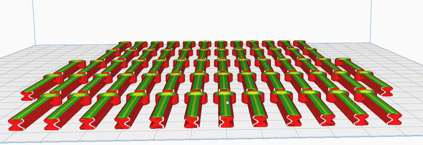 In nhiều chi tiết nhỏ trên build plate có thể hơi khó, nhớ cân bàn (level bed) kỹ và in chậm! Nếu bạn đủ kiên nhẫn để đan vớ thì chờ thêm 1 tiếng để in đám peg này cũng được. Mình thường giảm tốc thủ công ở layer đầu; nếu mọi thứ ổn thì tăng lại tốc độ bình thường.