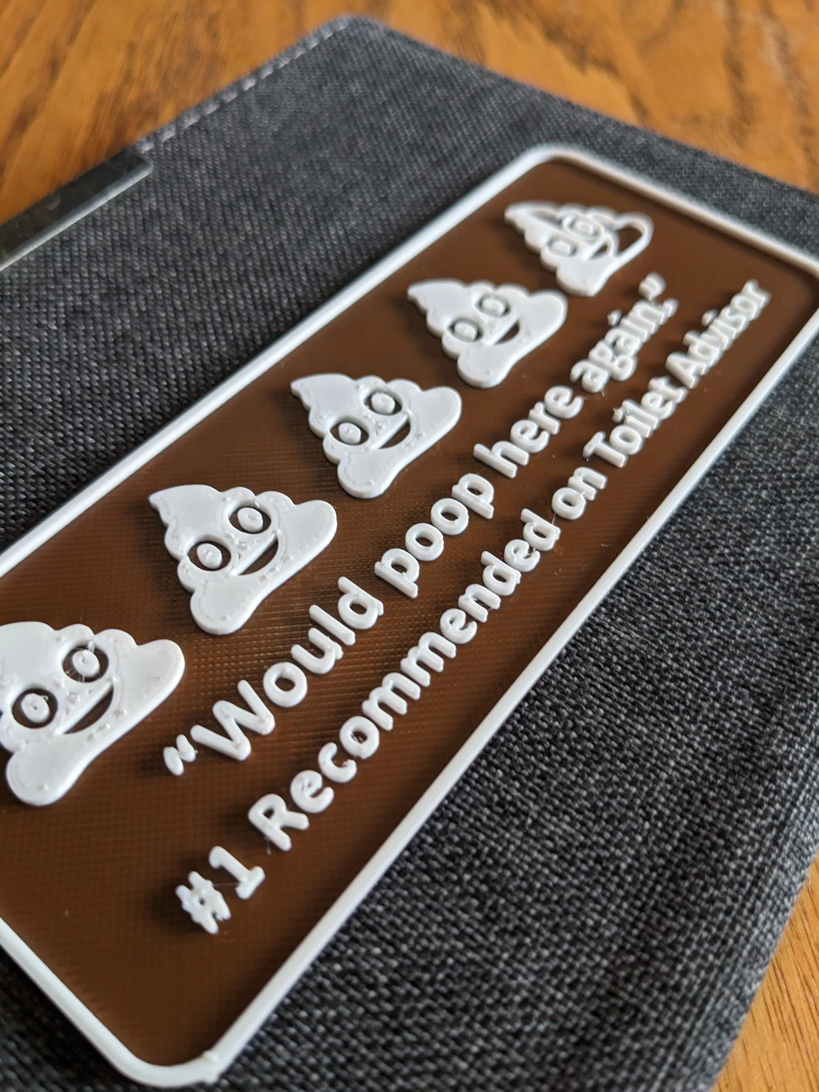 Bảng treo vui nhộn cho phòng tắm, remix phiên bản “Would Poop Here Again” kiểu Emoji. Có sẵn file .3MF/STEP/STL; bản .3MF “text with colour change” dùng PrusaSlicer 2.6.0b2 để thêm và chỉnh chữ dễ dàng.