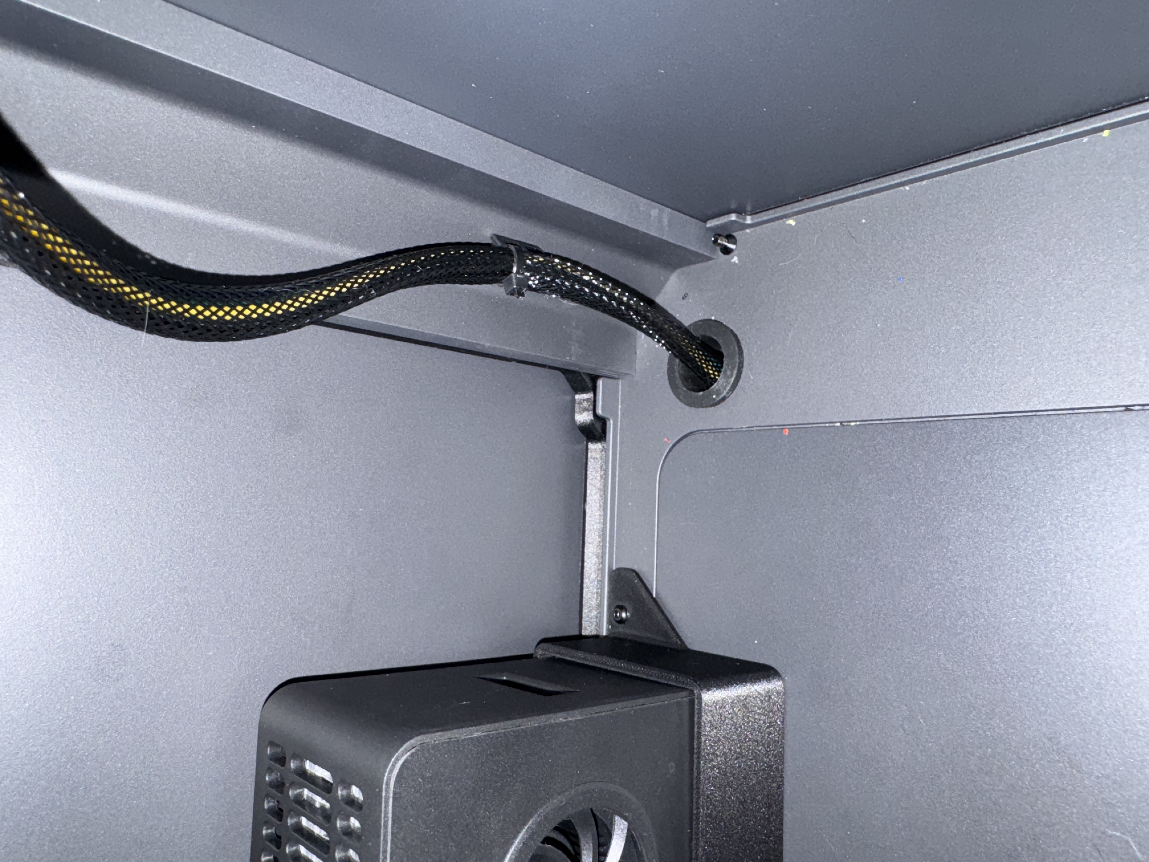 Phần này bắt vào lỗ ren M3 nằm ở bên trái phần đế máy in. Mình dùng bản của Fleeeinlan3D (dựa trên SE3D) là panel spacer 7.5mm để kê/đẩy panel bên trái ra một chút, nhờ vậy có thể đi dây nguồn và dây điều khiển ra ngoài máy in. Phần wire relief họ thêm vào dùng rất ổn.