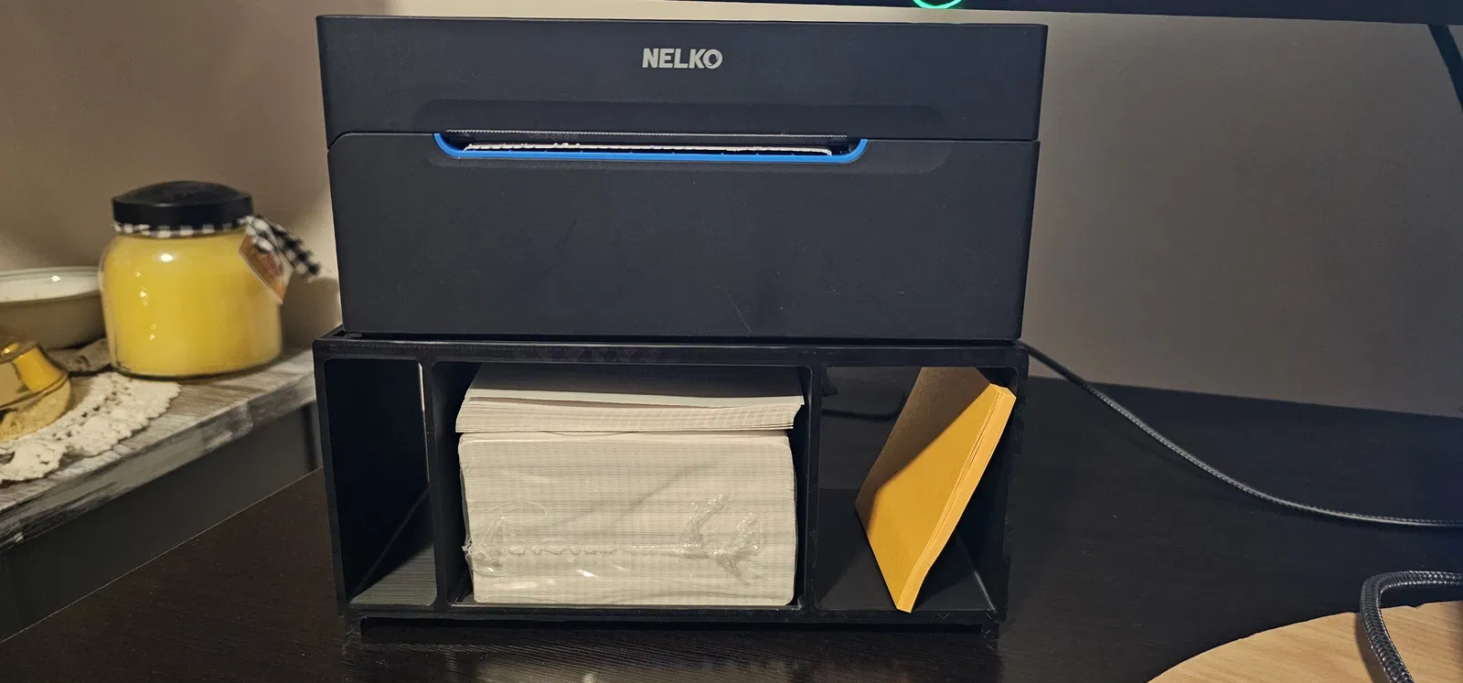Giá đỡ cho máy in tem nhiệt Nelko PL70e-BT, vừa giữ máy in vừa chứa được hơn 500 tem vận chuyển kích thước 100mm x 150mm. Khuyến nghị in PLA, không cần supports, infill gyroid 15%.