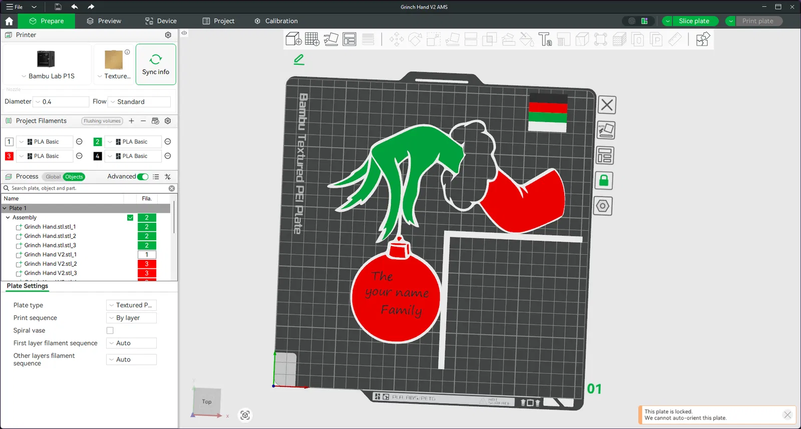 Bàn tay Grinch này treo một quả châu tròn và bạn có thể tùy biến theo họ gia đình. File 3MF đã được tách sẵn cho AMS, nên phần tay, tay áo, viền lông, khung, quả châu và chữ sẽ in tách màu riêng, làm một lần là xong.