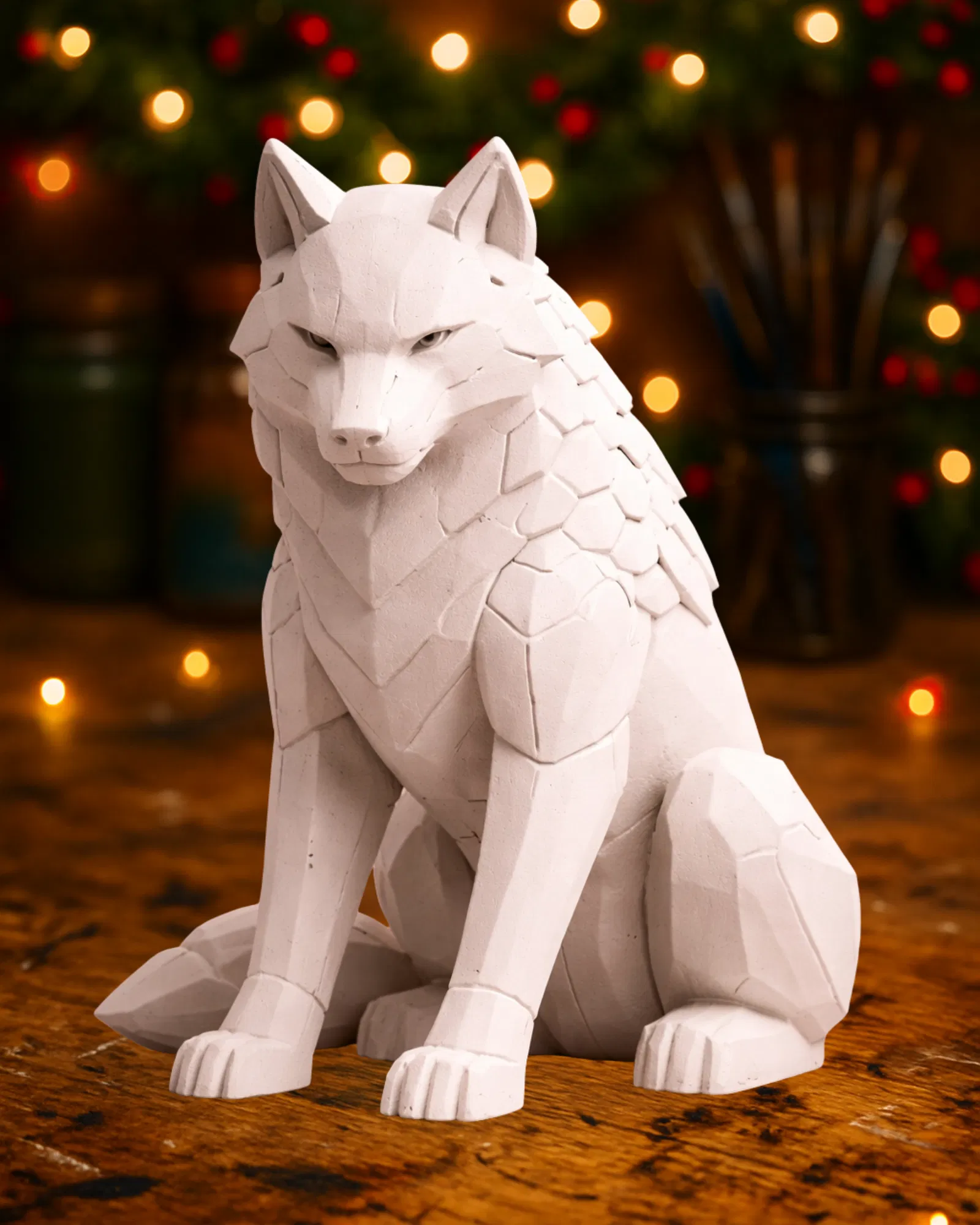 Một mẫu tượng sói hình học hiện đại với các mảng đa giác gọn gàng, dáng đứng điềm tĩnh nhưng vẫn toát lên vẻ mạnh mẽ.