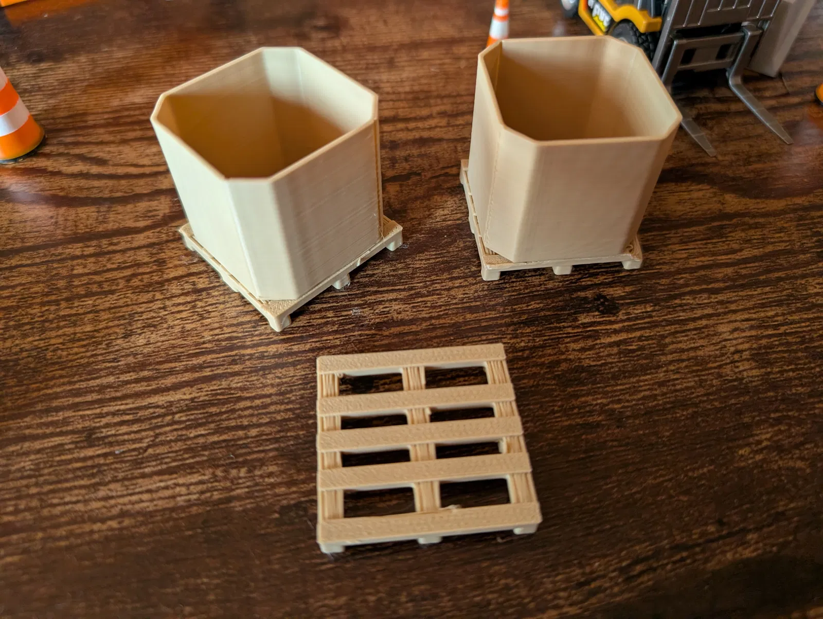 Bộ pallet và thùng (bin) tỉ lệ 1:32 này được thiết kế riêng để đi chung với xe nâng 1:32 của mình, kệ pallet (pallet rack) và các mô hình kiểu kho bãi khác.