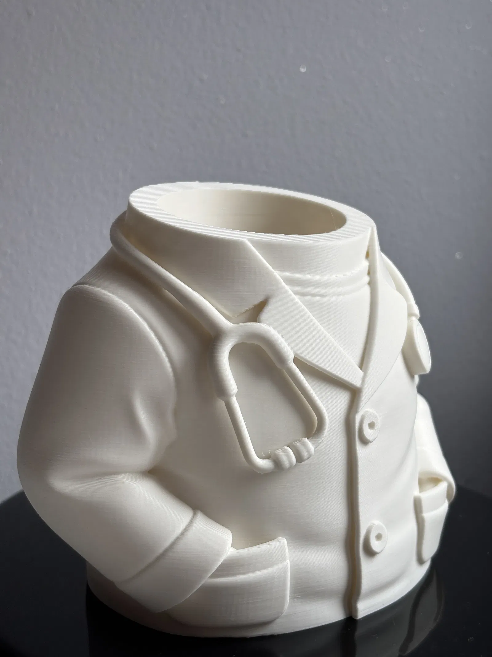 Ống cắm bút/desk organizer hình thân trên bác sĩ với áo blouse và ống nghe. Dễ in, ít support, in nhanh; cắm bút, bút chì, marker gọn gàng. Hợp làm quà cho bác sĩ, y tá, sinh viên y.