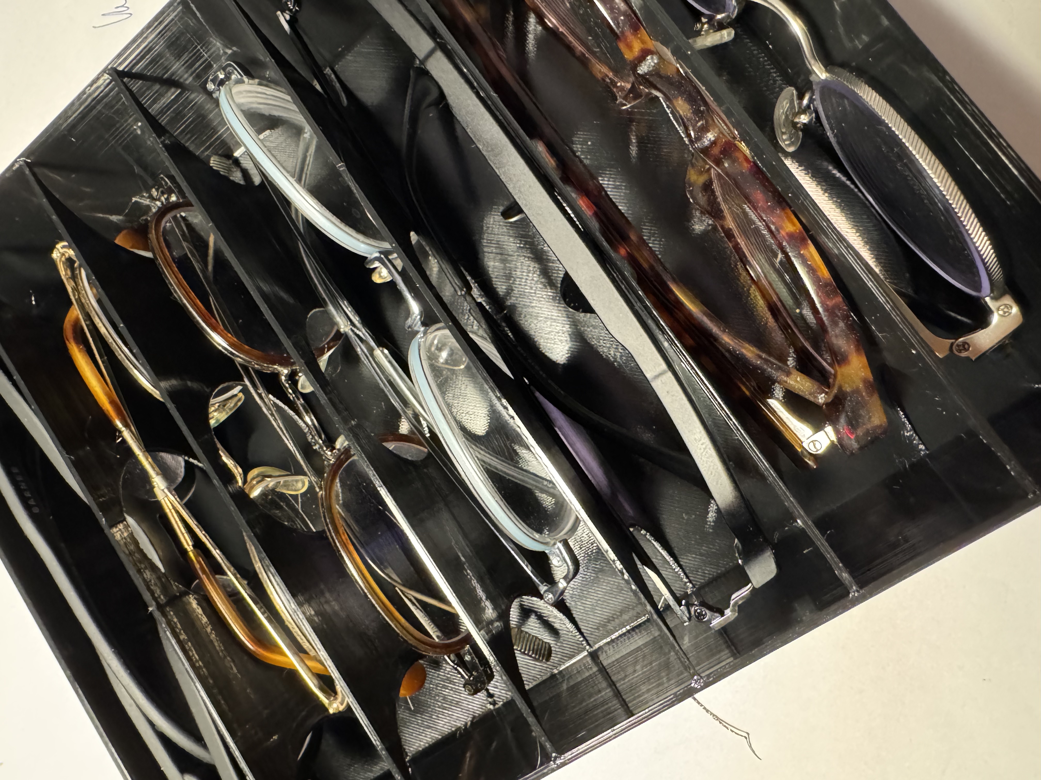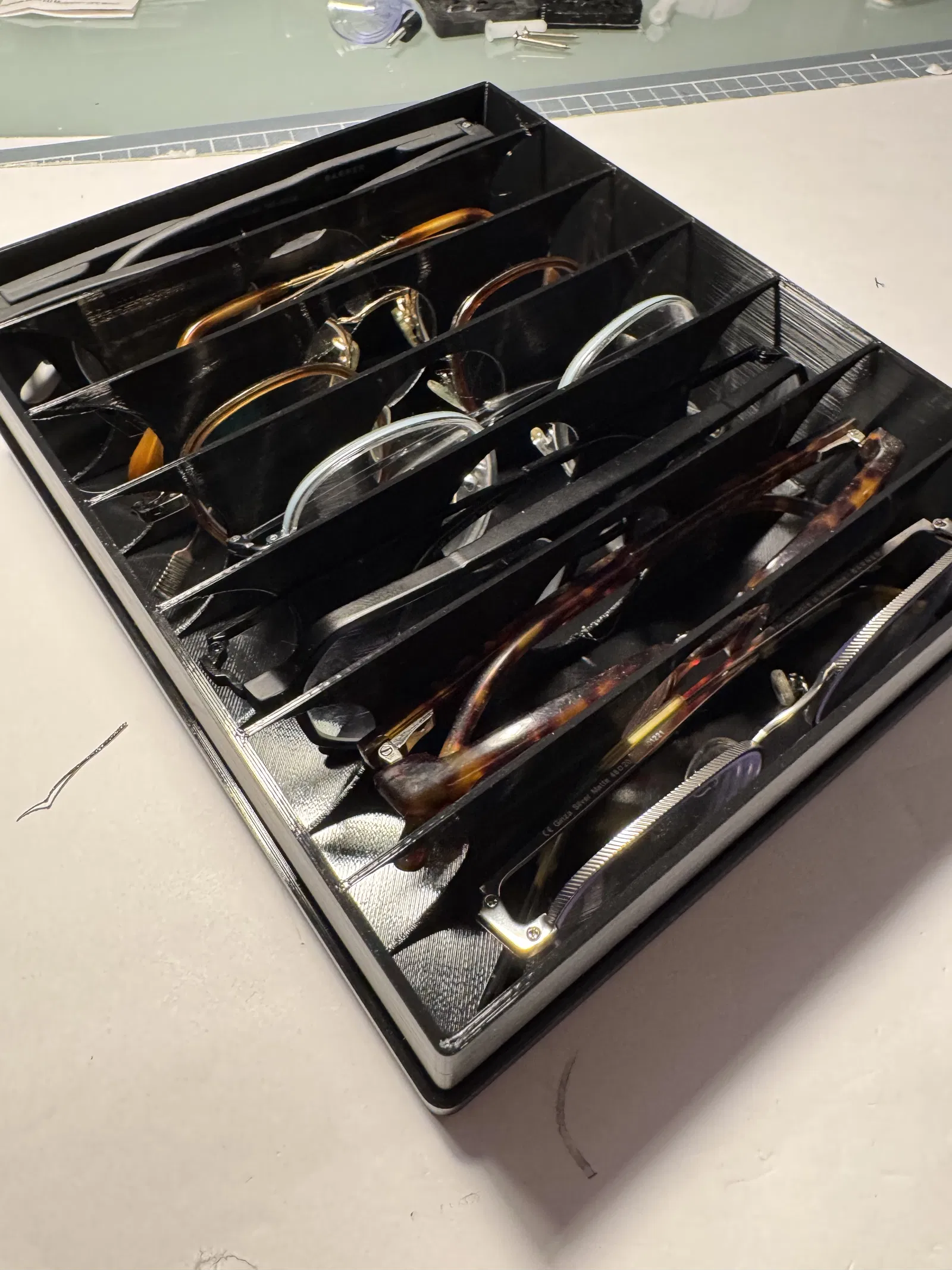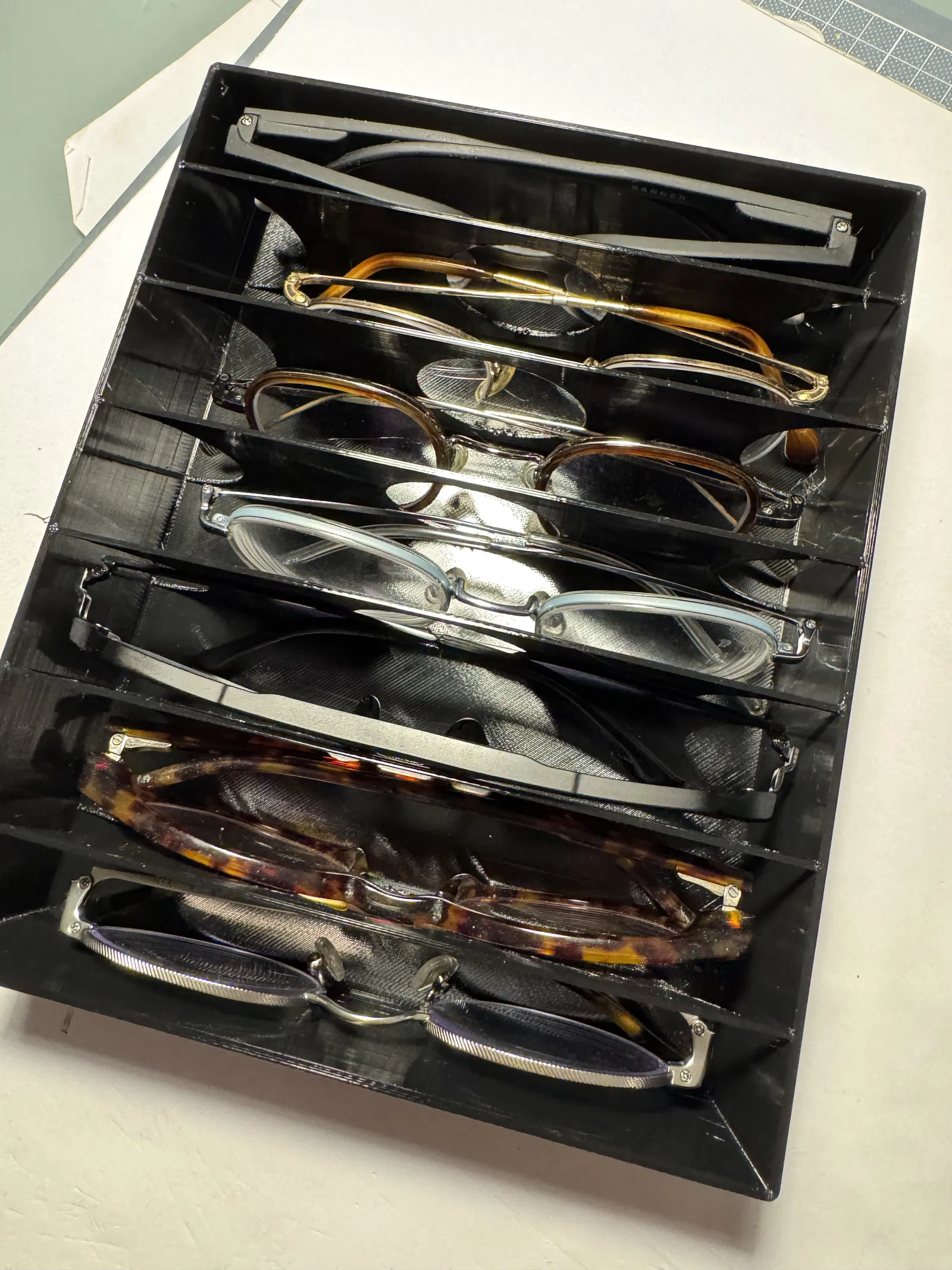Hộp du lịch dạng cứng để chứa 7 kính mát/kính lọc ánh sáng xanh. Kích thước tối ưu cho đa số loại kính, phù hợp để cất giữ và vận chuyển trong hành lý. Gợi ý in PETG 0.2mm, có brim & support.