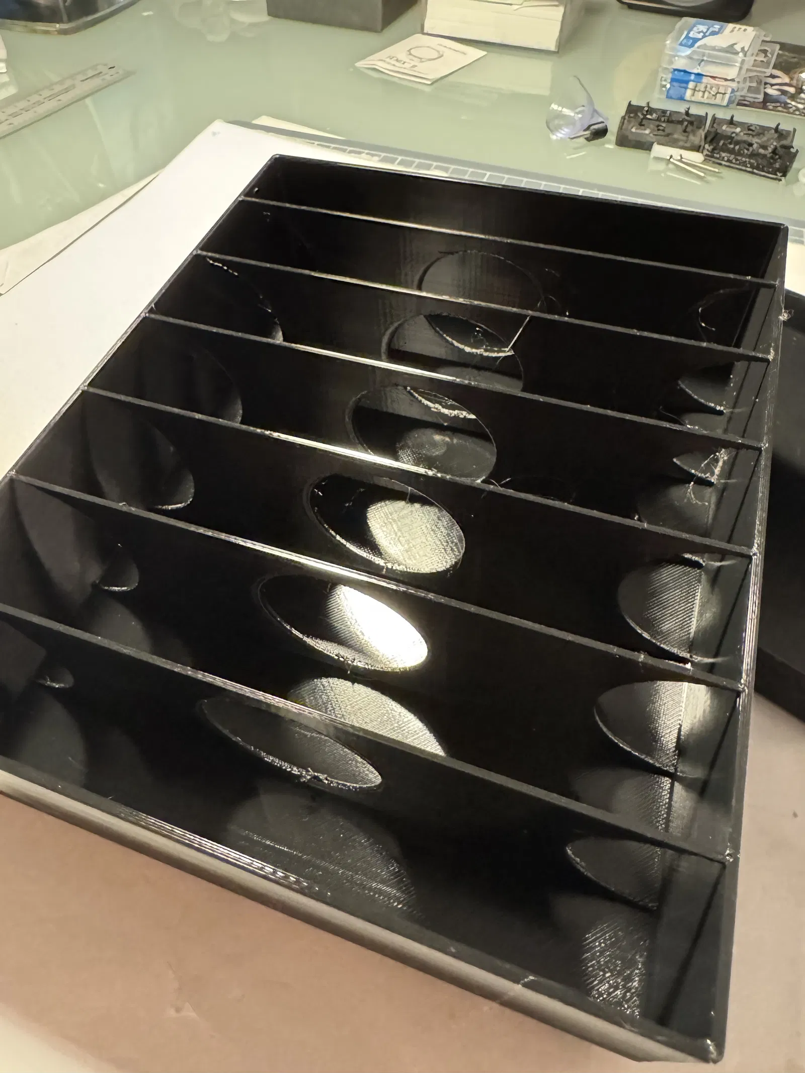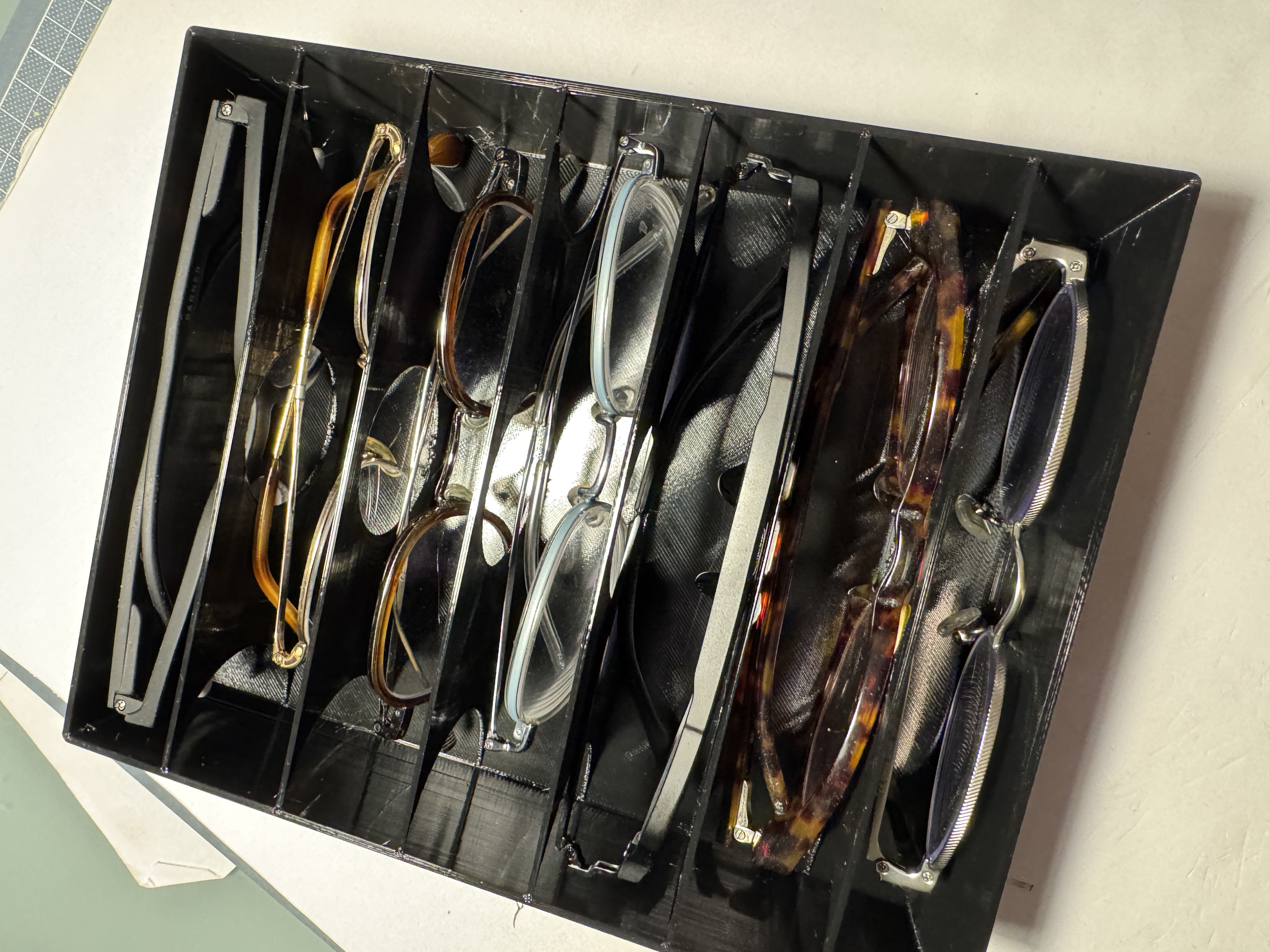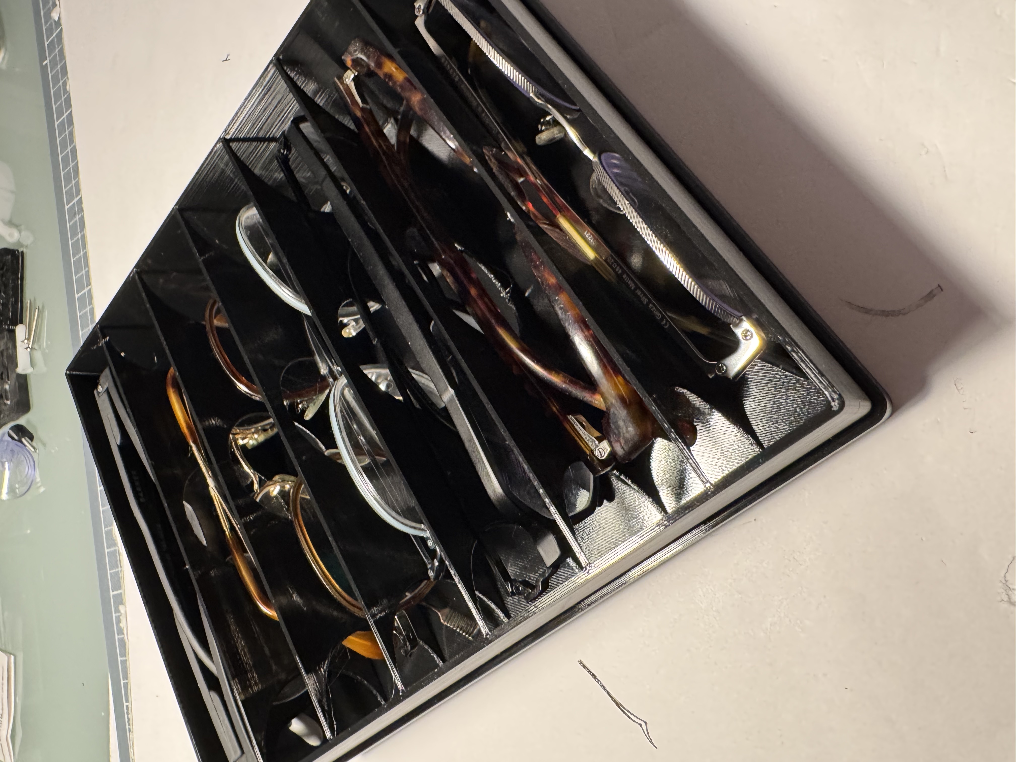 Hộp du lịch dạng cứng để chứa 7 kính mát/kính lọc ánh sáng xanh. Kích thước tối ưu cho đa số loại kính, phù hợp để cất giữ và vận chuyển trong hành lý. Gợi ý in PETG 0.2mm, có brim & support.