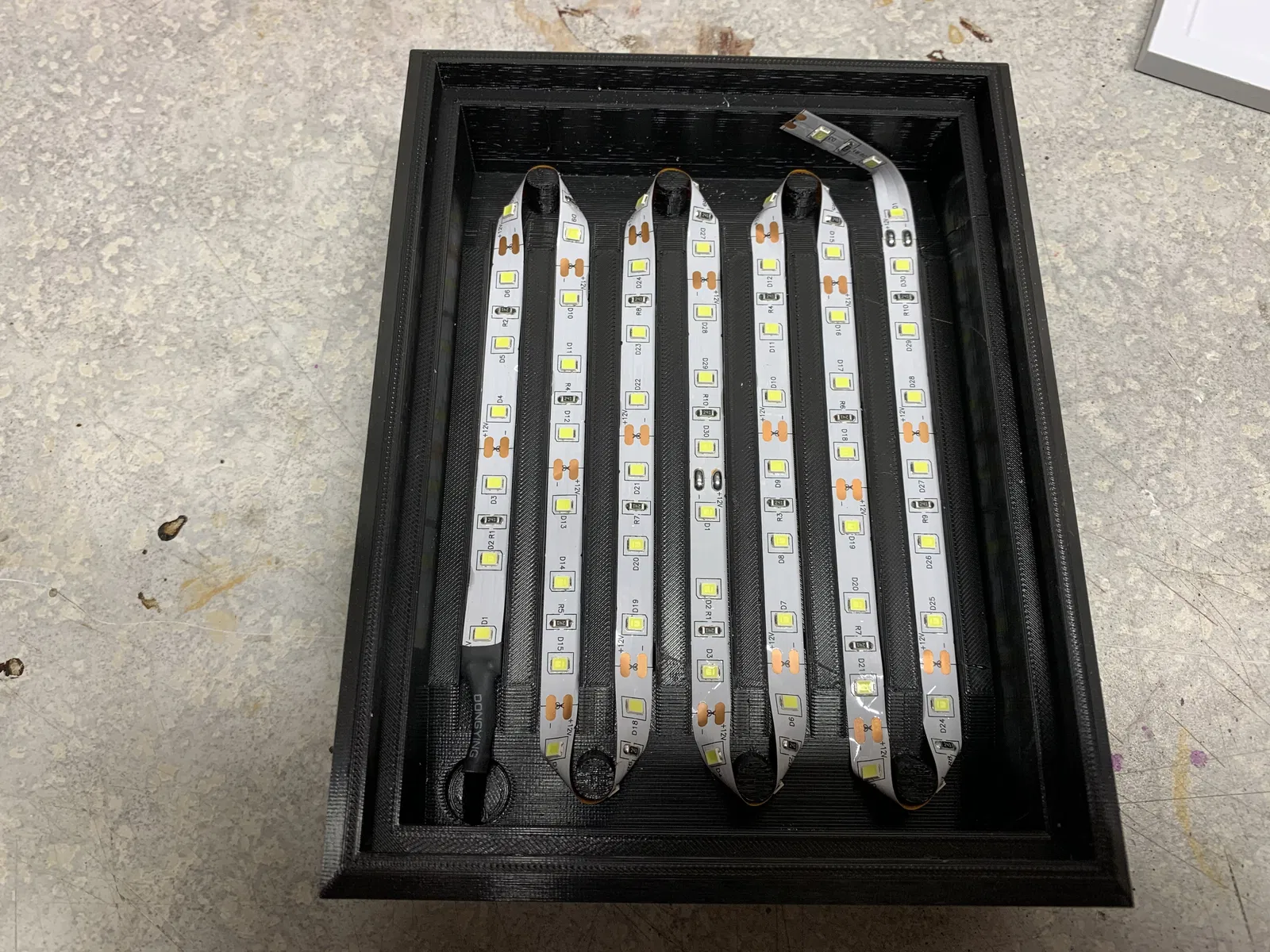 Đây là một hộp đèn lithophane mà mình thiết kế để dùng dây đèn LED strip loại mềm (flexible) làm nguồn sáng. Bên trong hộp có các rãnh để đi dây đèn, giúp ánh sáng hắt sau đều trên tấm lithophane. Mình nhỏ thêm vài giọt keo siêu dính (super glue) ngoài lớp băng keo sẵn trên đèn để đảm bảo về lâu dài đèn vẫn dính chắc.