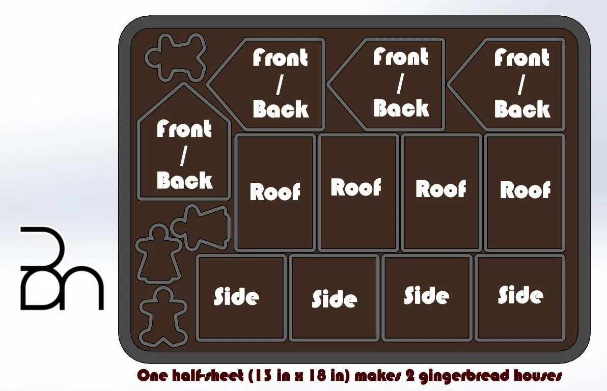 Bộ khuôn cắt bánh để tự làm nhà bánh gừng: một mẫu nhà truyền thống mái gable roof và một mẫu nhà truncated icosohedron độc đáo. Kèm công thức bánh gừng và kem trang trí, cùng thông số in gợi ý 0.2 mm.