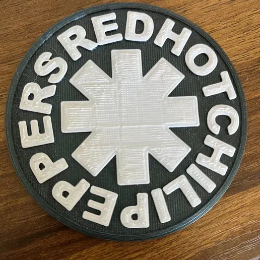 Coaster để ly với logo ban nhạc Red Hot Chili Peppers. In bằng cách layer change ở độ cao chữ để tạo 2 màu, dùng infill 100%. Có thể scale tùy ý; nên phối đỏ/trắng/đen cho giống logo gốc.
