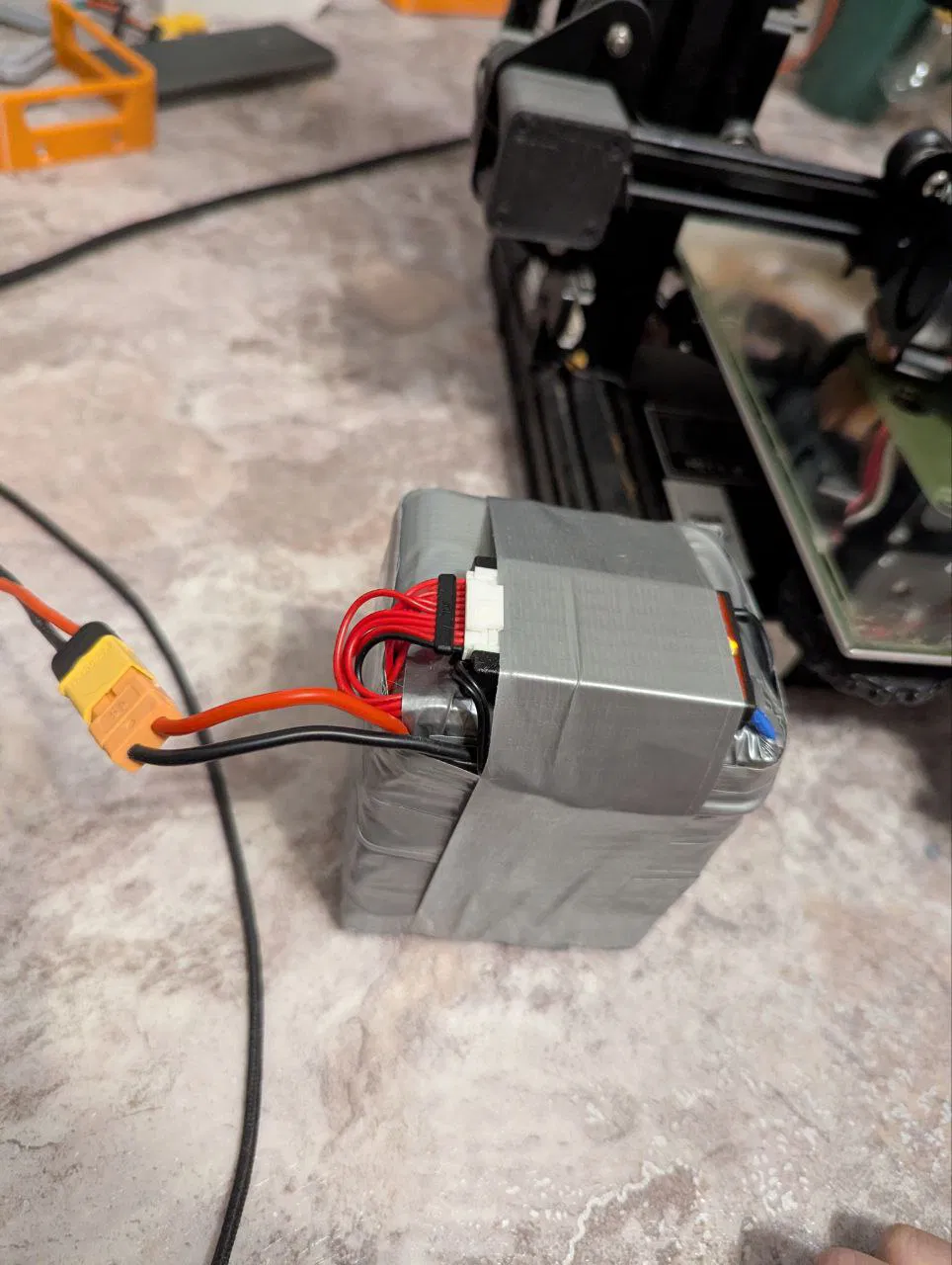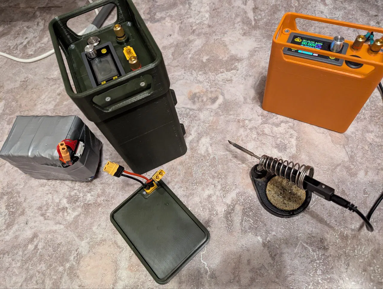 Ở bản của mình, việc sạc pin dùng bộ sạc của hoverboard (xe điện cân bằng) với điện áp 42V và dòng 2A. Mình dùng relay 12V 20A của bơm xăng (98.З747-111АТ), vừa khít ở khoảng giữa màn hình và bo mạch; được cố định ở mặt sau màn hình bằng hai dải băng keo 2 mặt 3M. Để cấp nguồn cho relay và đèn nền của nút nguồn, mình dùng DC-DC converter có ngõ vào tới 60V. Tiếc là mình không biết mã hàng của nó. Miếng đệm cho đầu nối XT-60 phía mặt trước dùng để gắn đầu nối ra ngoài vỏ, nhưng không bắt buộc. Ở bản của mình, nếu gắn XT-60 ở trong thì bị vướng do dây của nó cấn vào heatsink của bo công suất. Có thể tăng chiều cao chân, hoặc kê thêm vài long đền dưới bo, nhưng lúc đó mình lười làm.