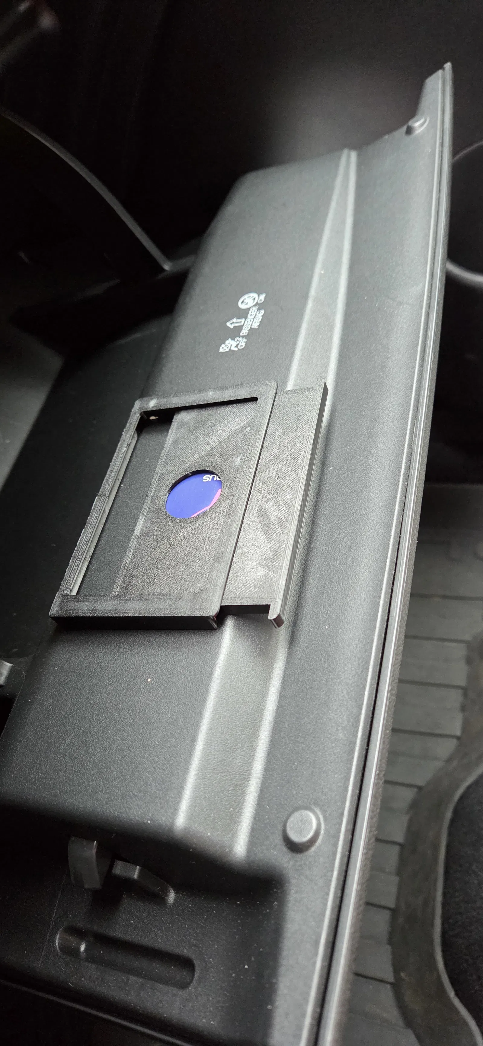 Ngăn kéo đựng thẻ RFID nhỏ gọn, dán bằng băng keo 2 mặt để lắp dưới taplo, trong glove box hoặc bệ tỳ tay. Rút thẻ nhanh, đóng lại kín đáo; có thêm bản góc chamfer tối ưu cho Nissan Leaf.