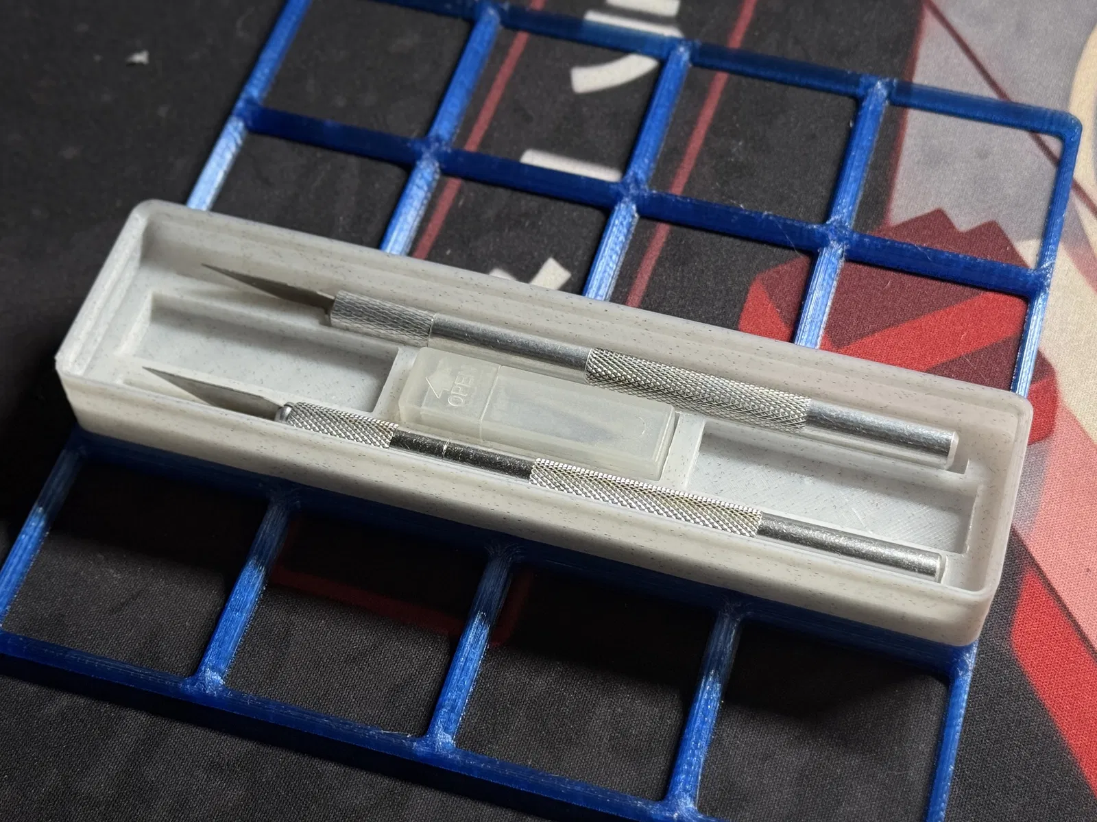 Khay Gridfinity 4x1 dùng để sắp xếp dao mô hình: chứa 3 dao, hoặc 2 dao kèm lưỡi dao dự phòng. Thiết kế hộp có thể xếp chồng, gọn gàng và tiện cho bàn làm việc.