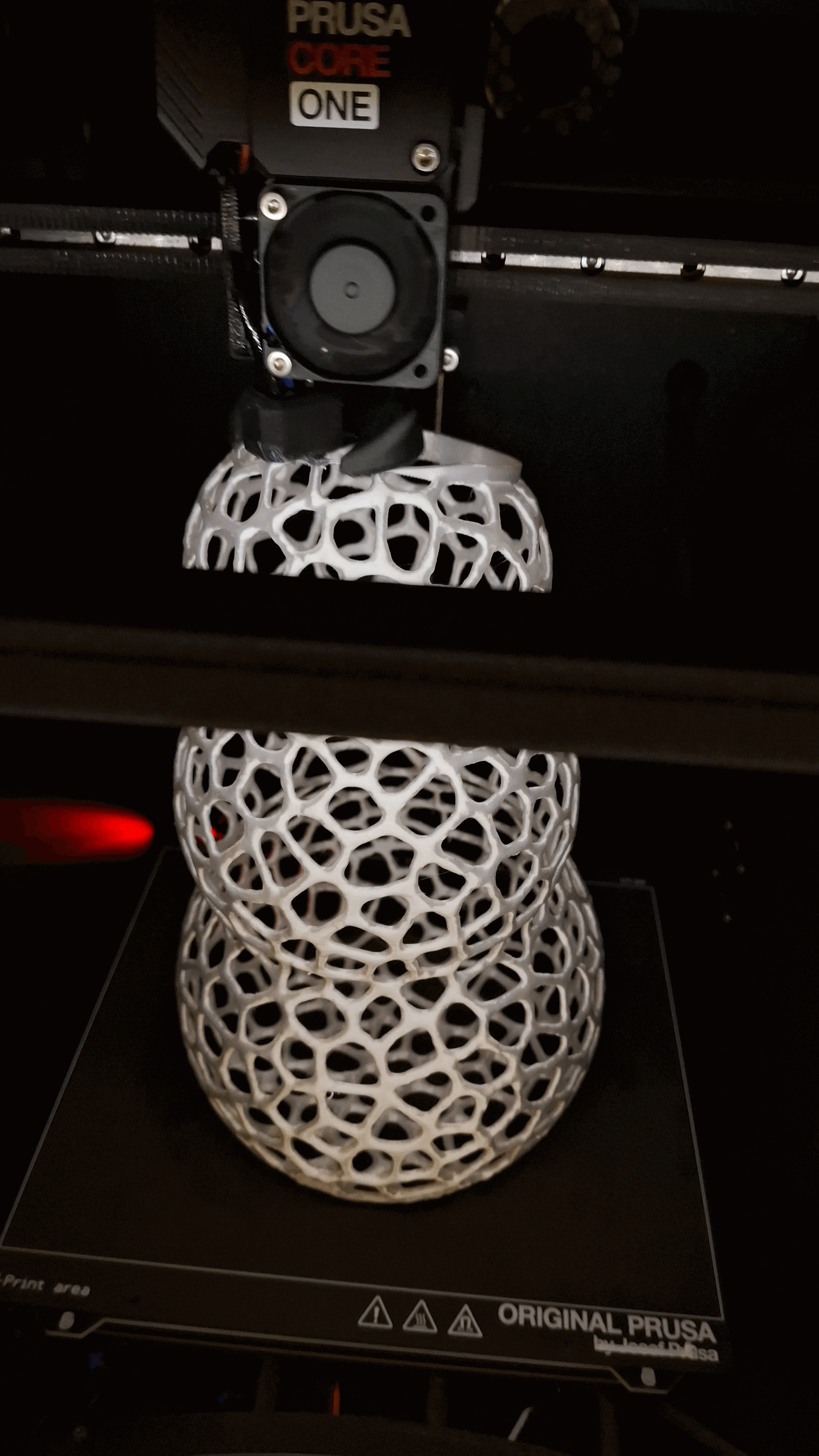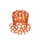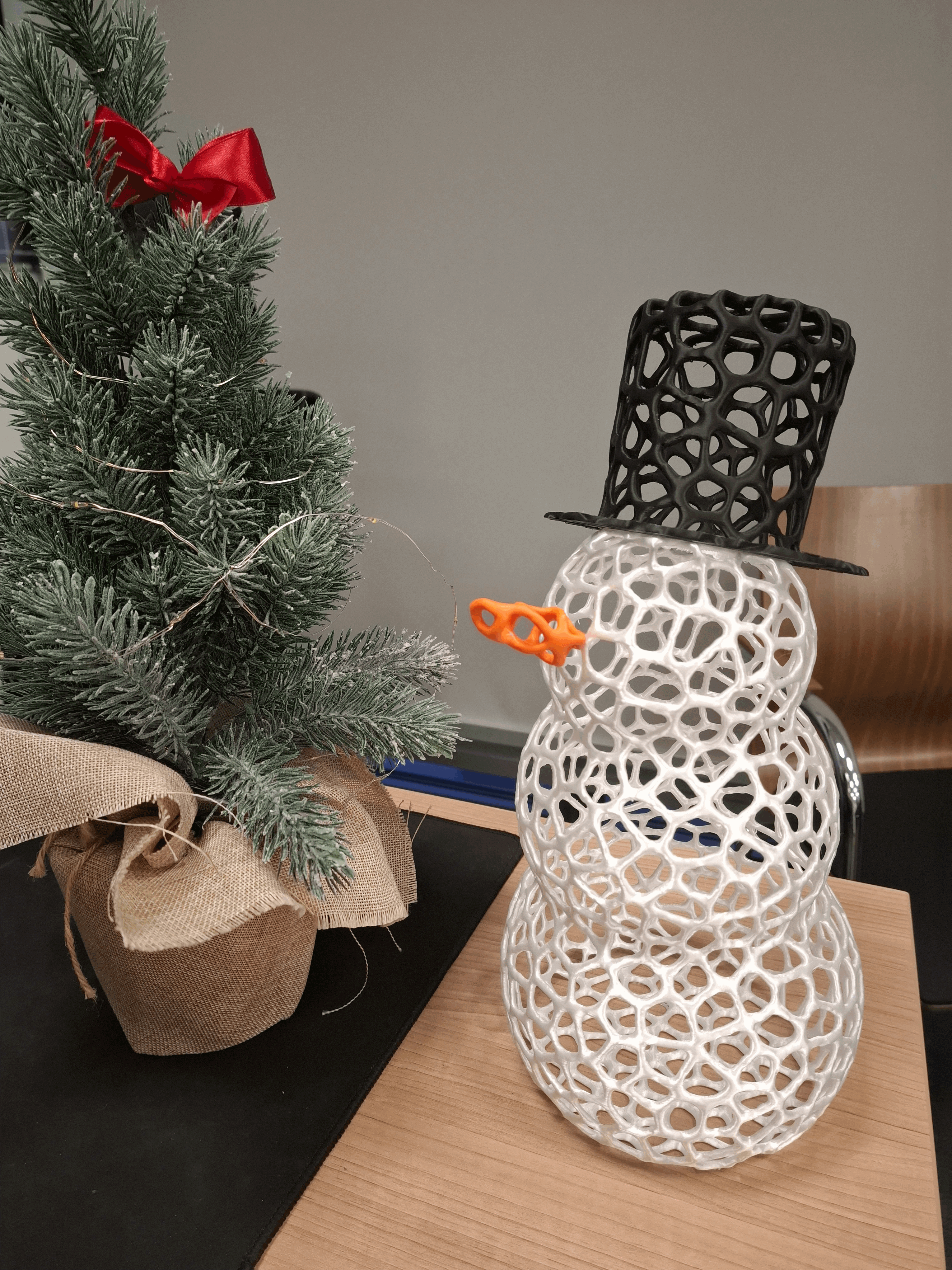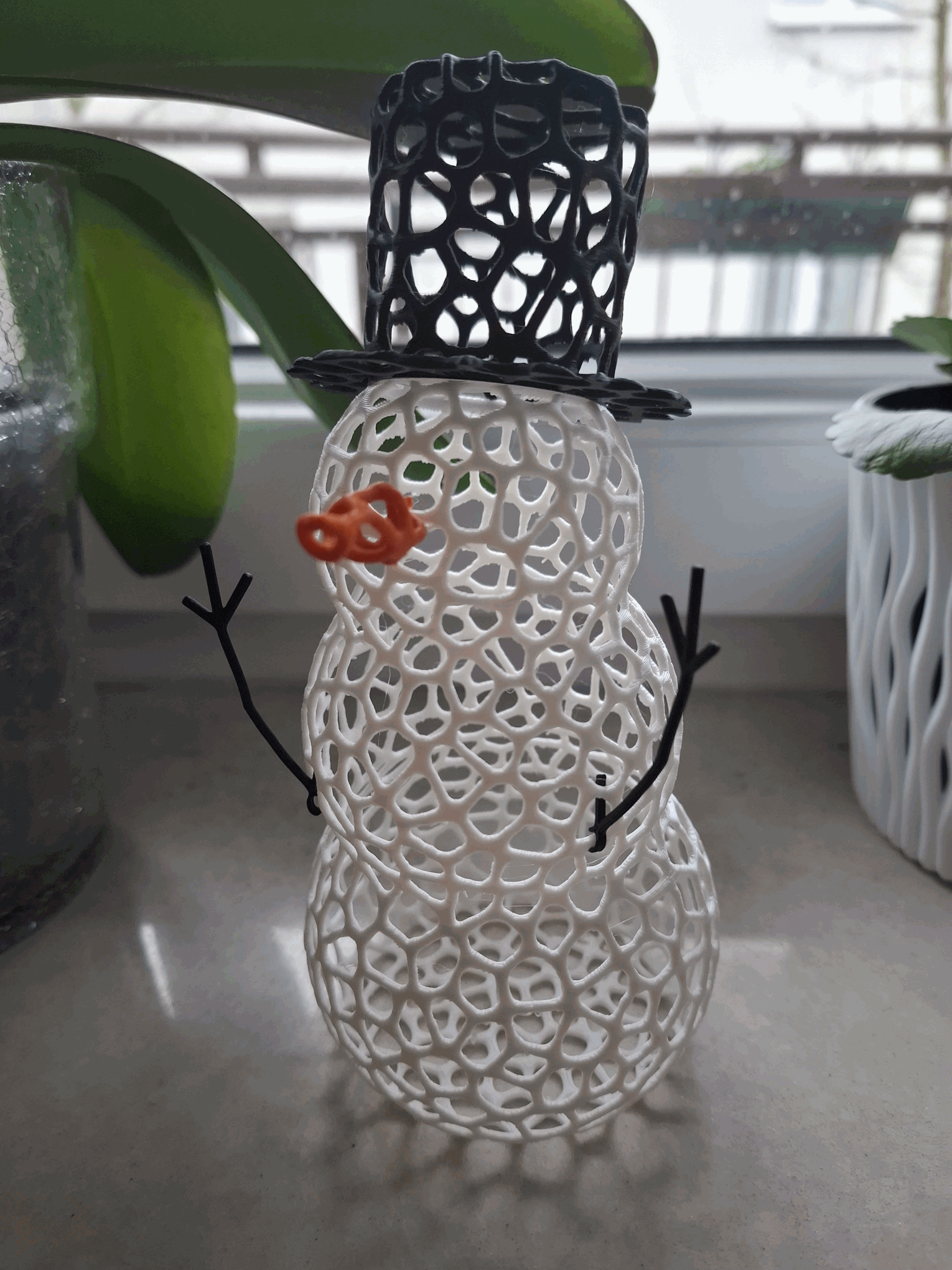 Người tuyết Voronoi với nón tháo rời và mũi cà rốt. In theo từng phần: thân có thể in không cần supports, còn nón và mũi nên dùng supports. Nón có thể dùng làm hũ đựng kẹo, nhưng miệng mở nhỏ (~8 cm).