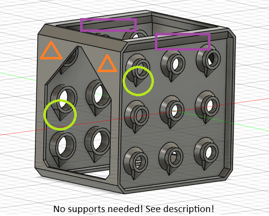Nếu bạn tò mò: các vòng tròn màu vàng là dạng teardrop để đỡ mặt dưới của lỗ. Các hình chữ nhật màu tím đánh dấu chamfer để đỡ mép tường phía trên. Các tam giác màu cam là webbing dùng để đỡ hai cái rail.