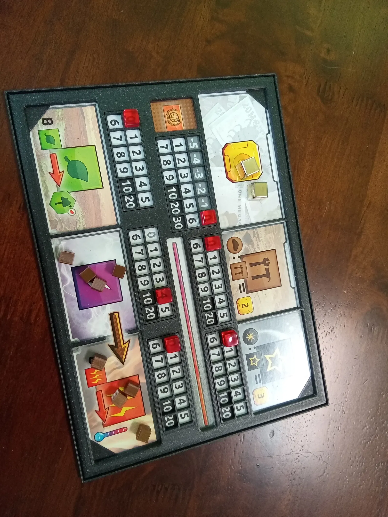Thiết kế ôm quanh player mat của Terraforming Mars để hạn chế lệch theo dõi production và vật phẩm tạo ra. Có khe pass-through energy→heat, chỉnh lại number grid và kẹp giữ overlay với mat, không cần keo/băng dính.