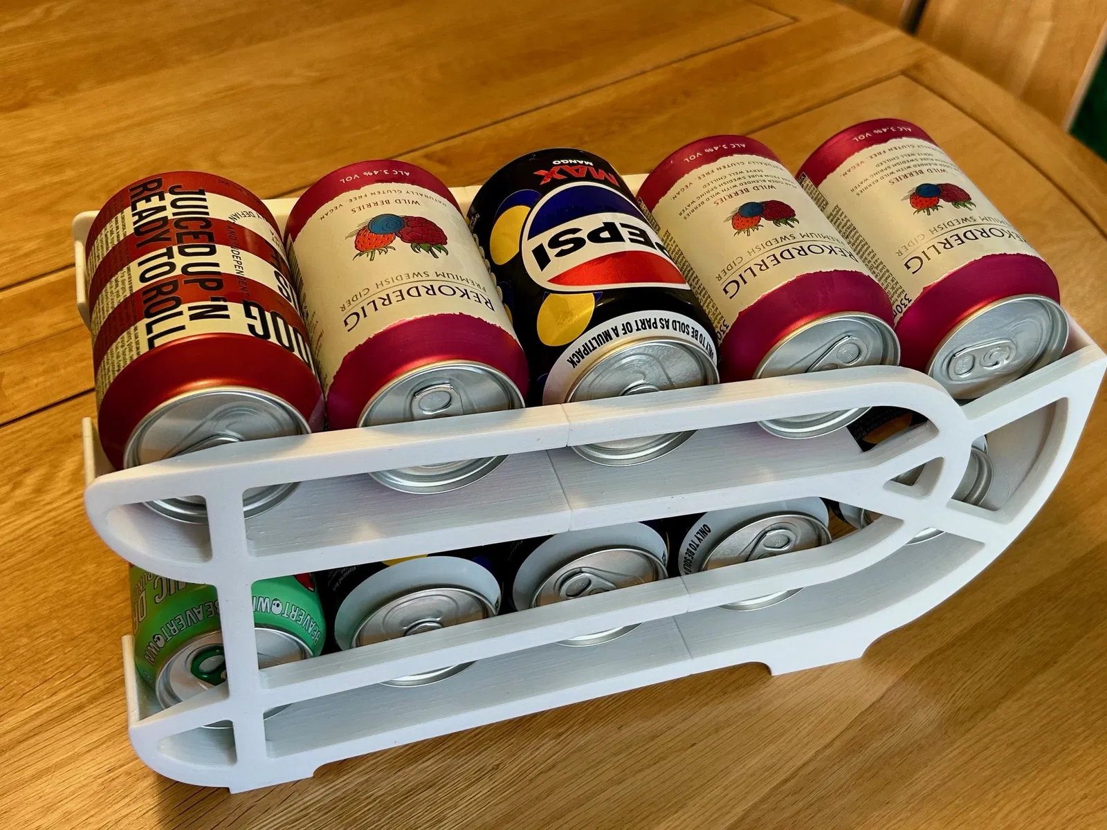Bộ chi tiết in lắp ráp khay nhả lon cho tủ lạnh, dùng cho lon UK/EU đường kính 66mm (330/440ml). Có bản kệ 350mm chứa 10 lon hoặc kệ 300mm chứa 8 lon; có pad hạn chế chạm dàn lạnh.