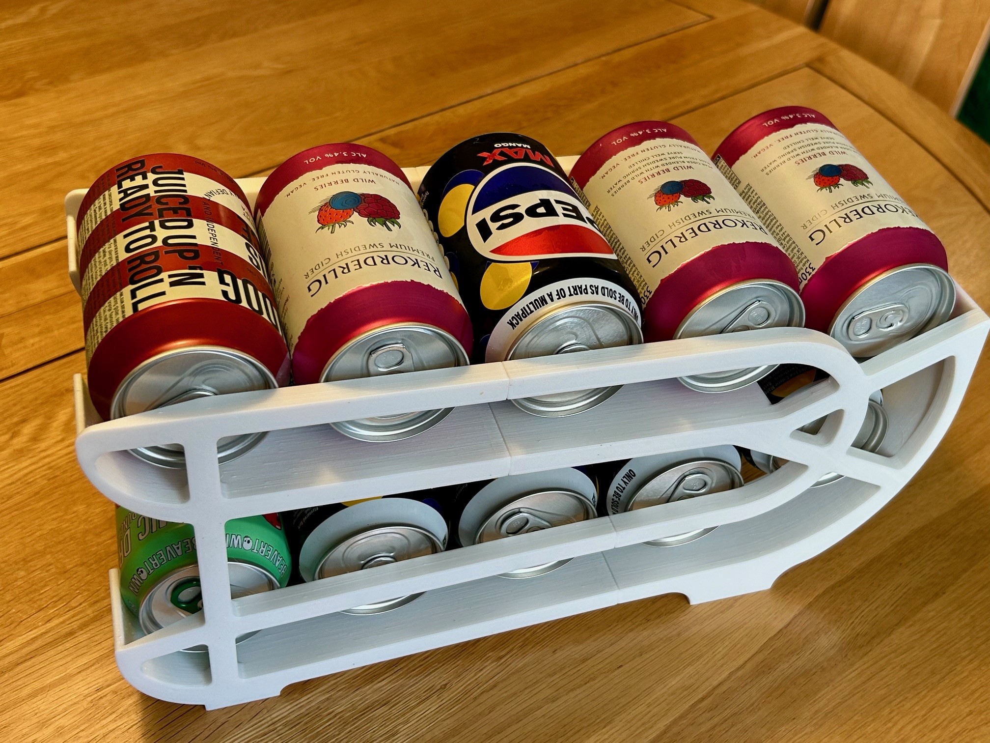 Đây là một bộ chi tiết để in, có thể cấu hình cho lon nước uống chuẩn UK/EU 330ml và 440ml (đường kính 66mm). Bạn cũng có thể cấu hình cho tủ lạnh lớn (kệ 350mm) để chứa 10 lon; hoặc tủ lạnh nhỏ gọn (kệ 300mm) để chứa 8 lon. Dùng bộ khung ‘10’ hoặc bộ khung ‘8’ tương ứng. Tất cả hình ảnh đều là phiên bản 10 lon. Cả hai phiên bản đều có miếng đệm “touch” ở phía sau (evaporator touch pads) để hạn chế tiếp xúc nếu lỡ chạm vào dàn lạnh/evaporator plate, tránh làm tủ bị “đổ mồ hôi” nhiều và nước ngưng tụ chảy tràn.