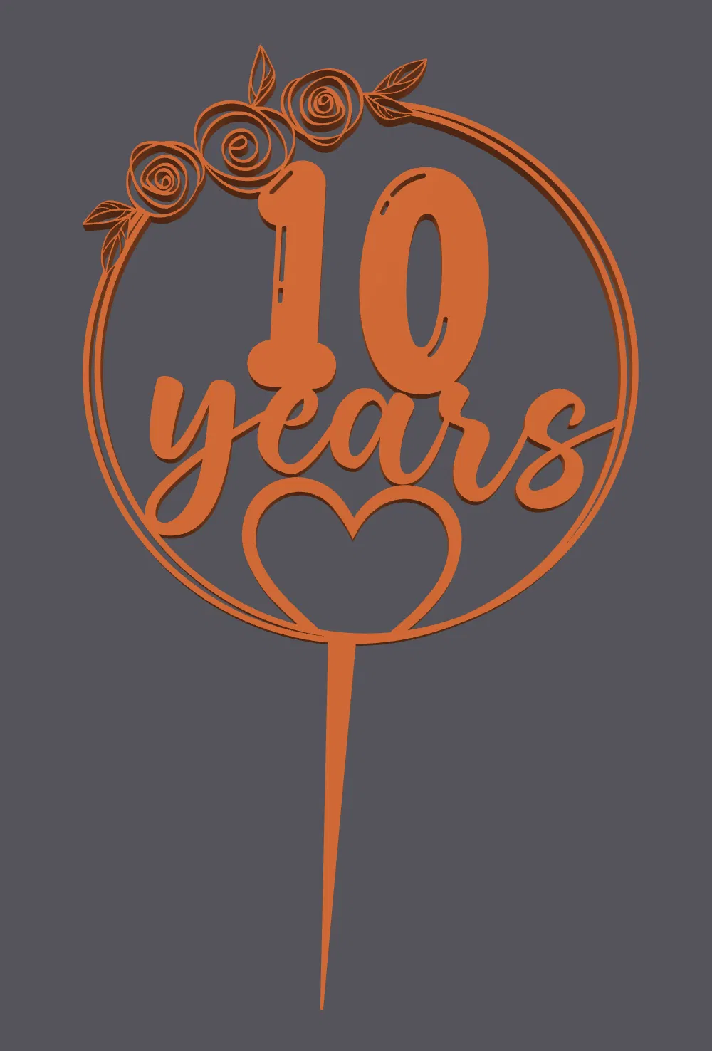 Topper trang trí bánh in 3D hình trái tim kèm chữ “10 năm”, phù hợp sinh nhật, kỷ niệm hay tiệc đặc biệt. Thiết kế đơn giản, tinh tế, dễ in với PLA, layer 0.2 mm, infill 10–15%, không cần supports.