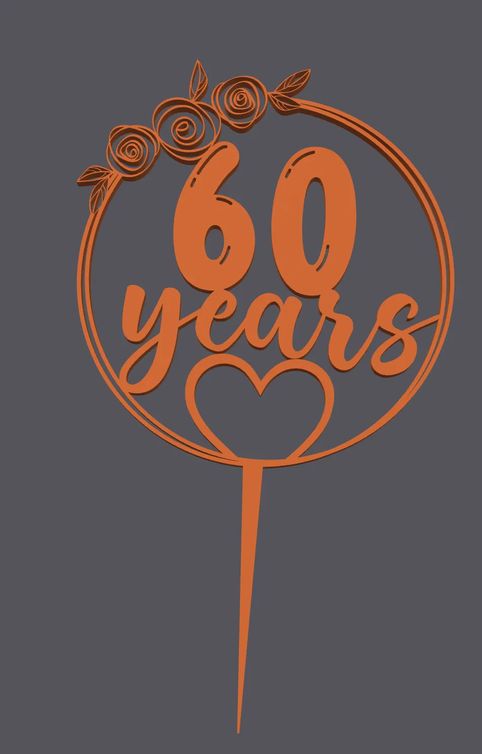 Topper trang trí bánh hình trái tim kèm chữ “60 tuổi/60 years”, phù hợp sinh nhật, kỷ niệm hay dịp đặc biệt. Thiết kế đơn giản, dễ in với PLA, in phẳng, không cần supports; có thể chỉnh chữ và scale theo độ tuổi.