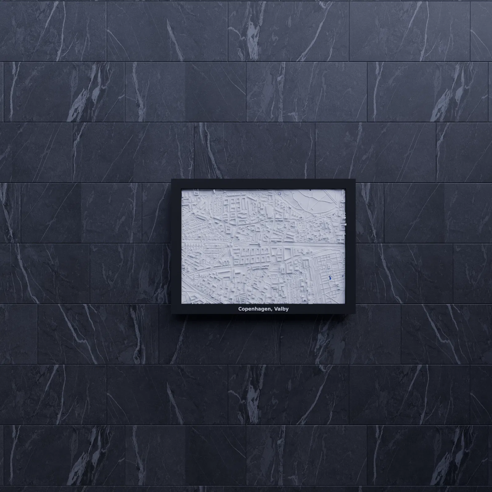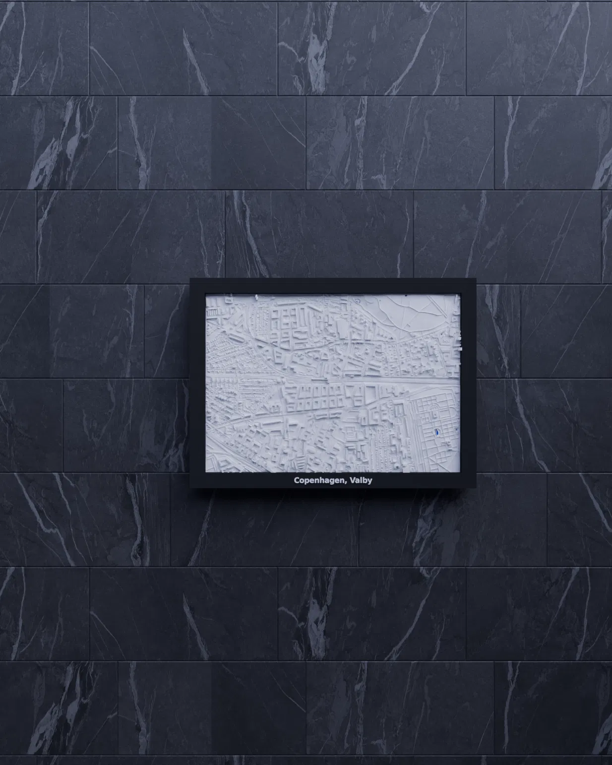 Mô hình địa hình (topographic) thu nhỏ 3D của Copenhagen, Valby (Đan Mạch), dựng từ dữ liệu địa lý. Thu nhỏ khu vực 2.068 x 1.446 km thành kích thước in 170.5 x 119.5 mm, có frame kèm theo.