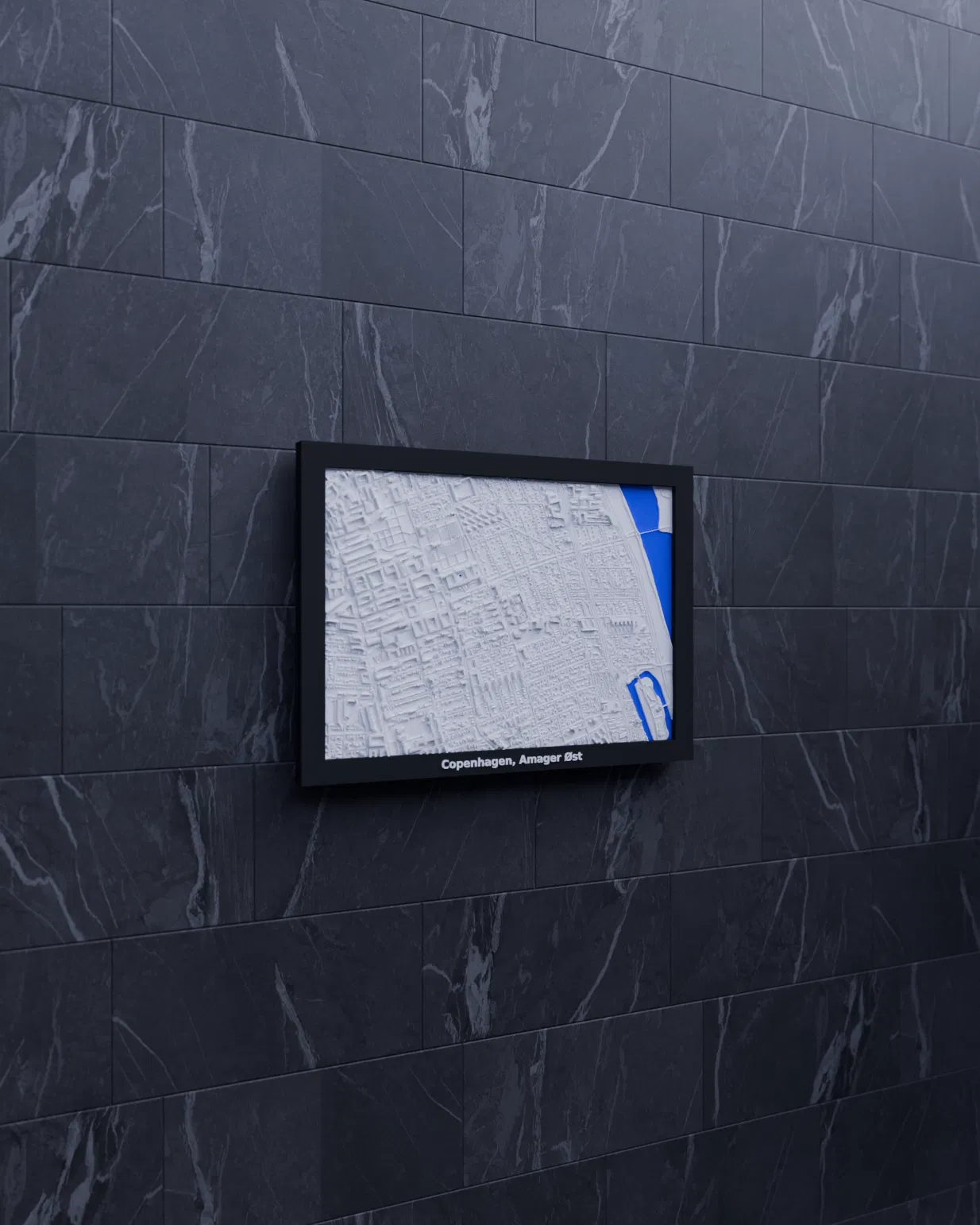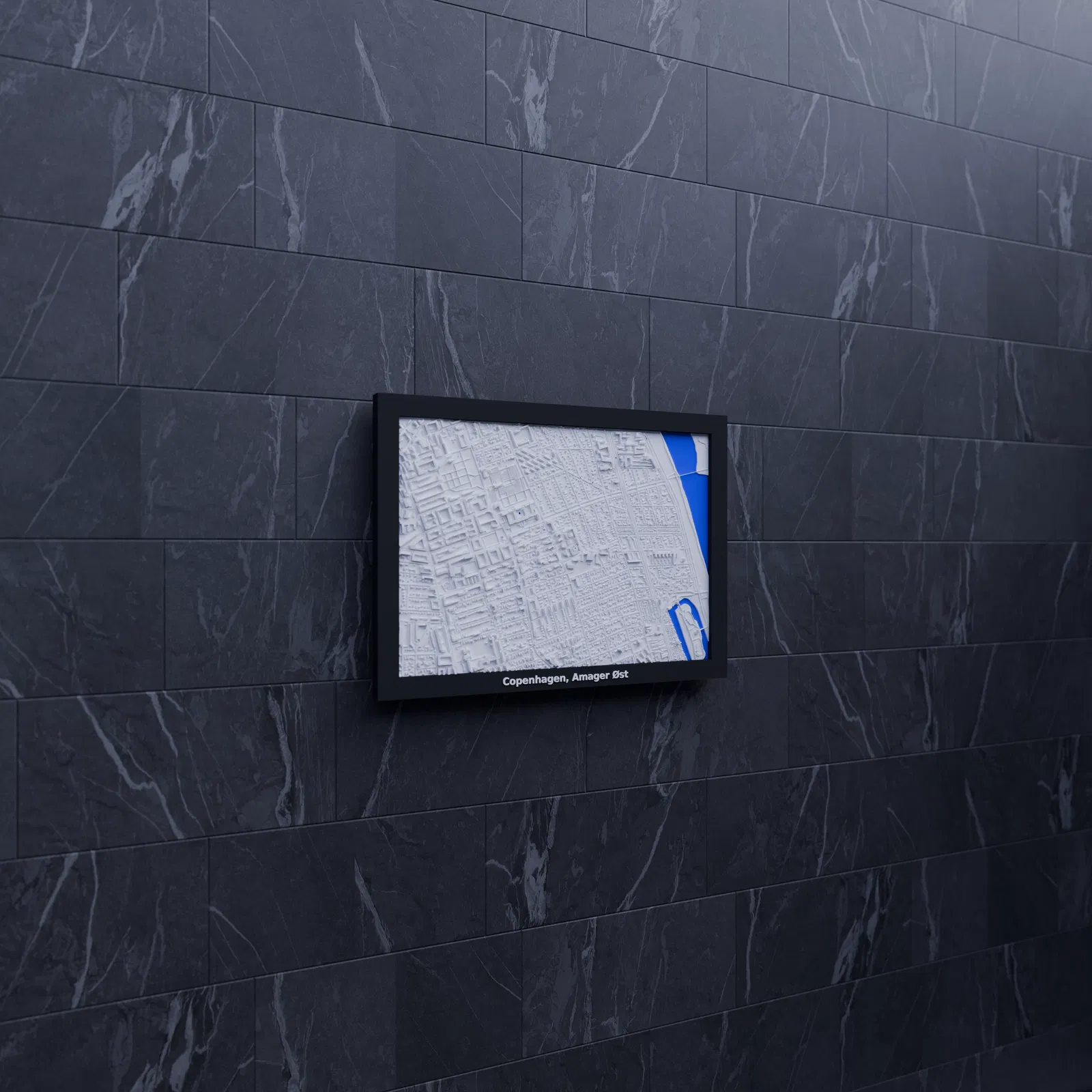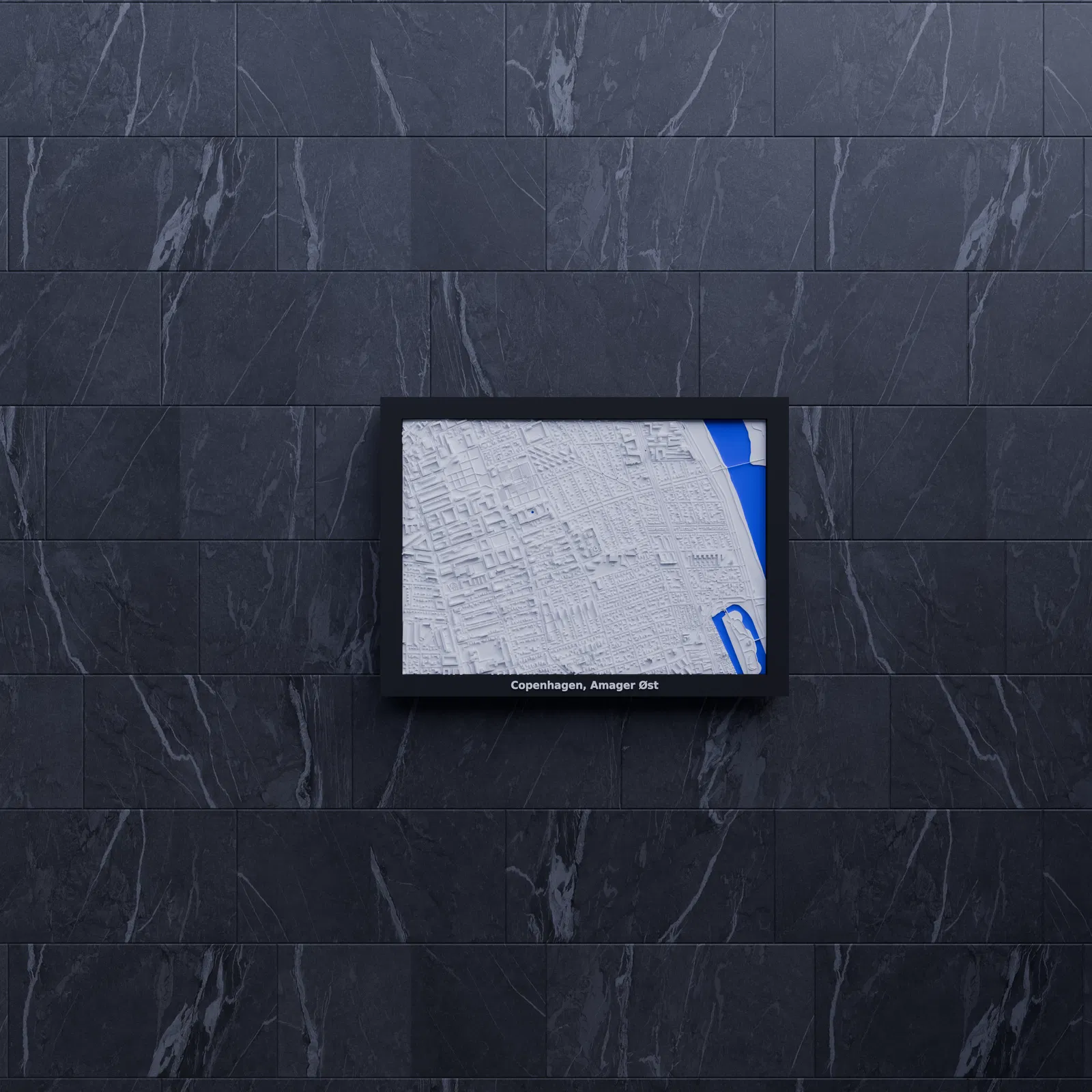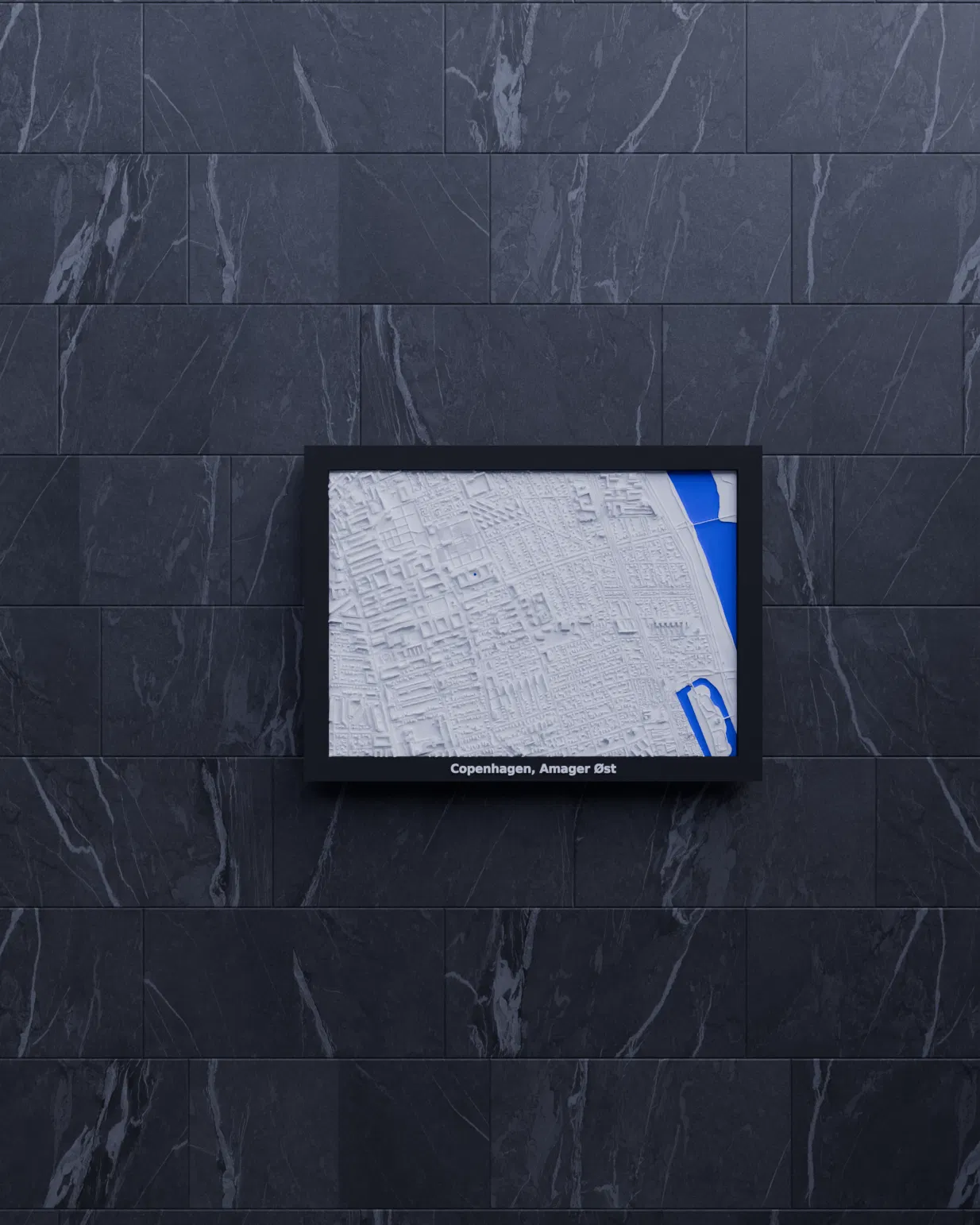 Mô hình địa hình (topographic) 3D thu nhỏ khu Copenhagen, Amager Øst theo dữ liệu địa lý, đúng tọa độ 55.653, 12.625. Kèm nhiều frame có lỗ treo; phù hợp in PLA để decor, học tập hoặc trình bày kiến trúc.