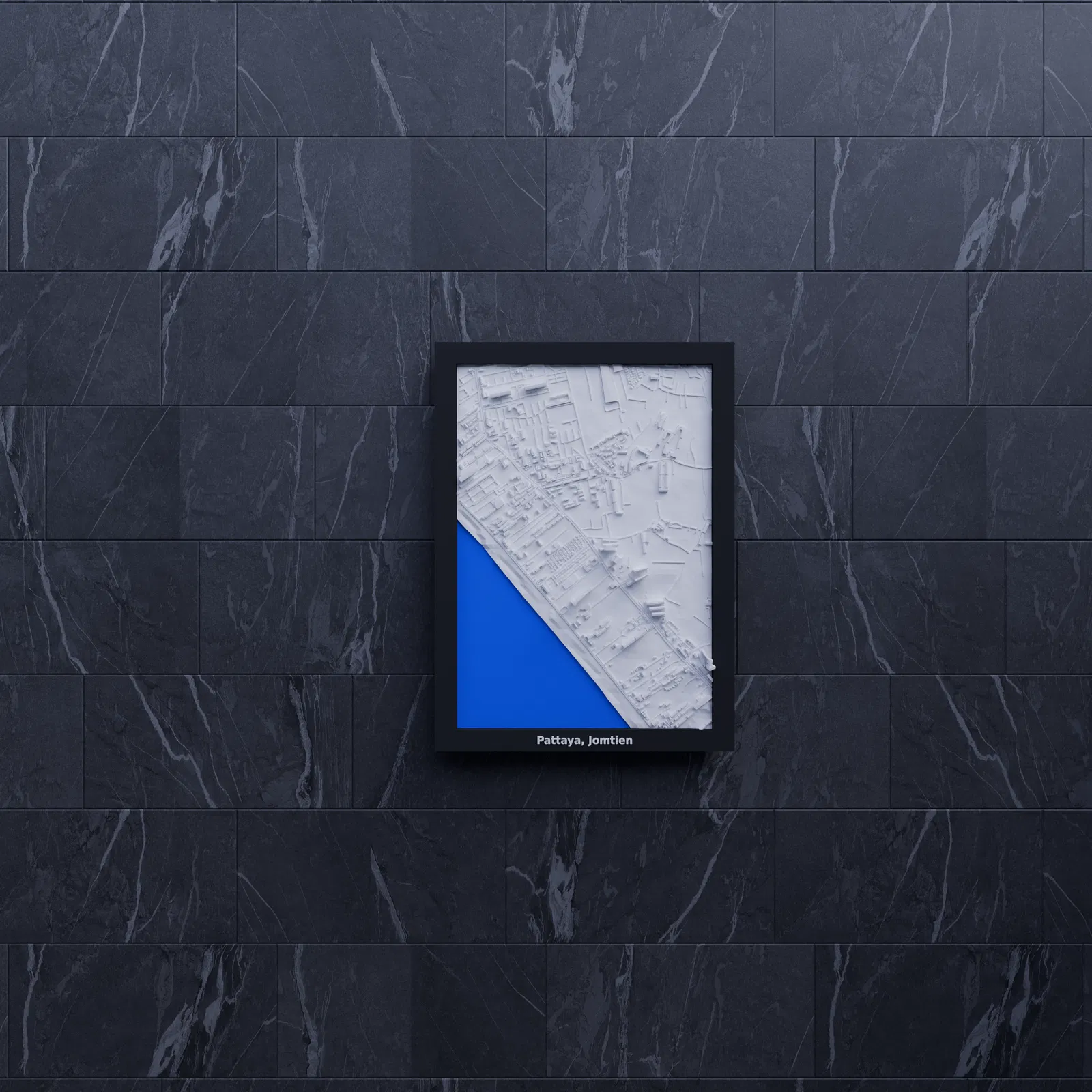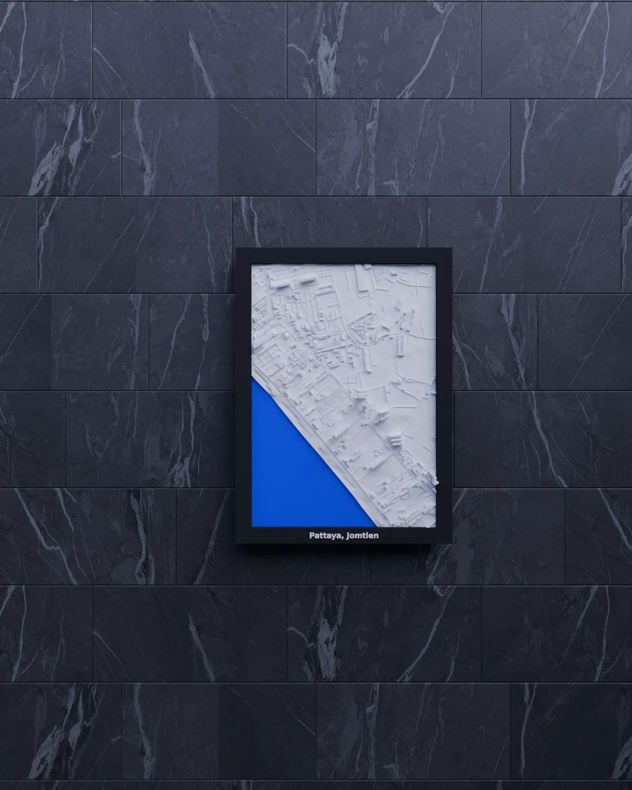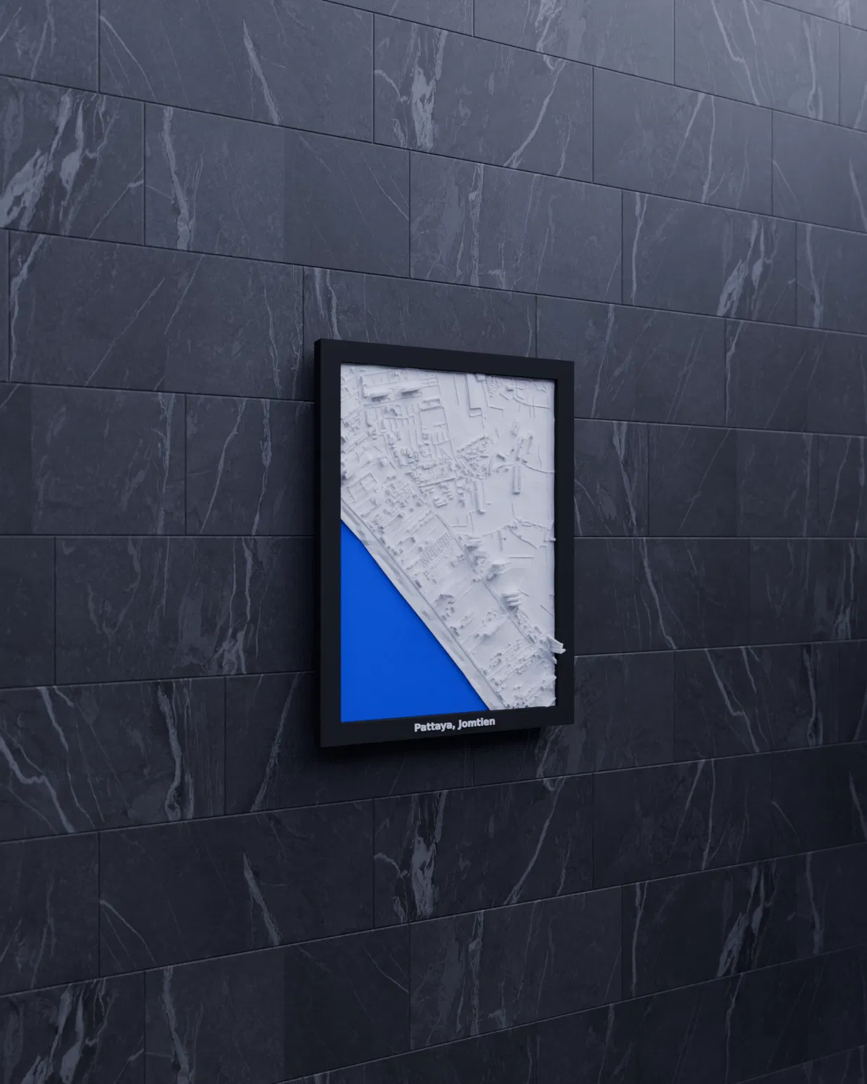 Mô hình topographic 3D thu nhỏ tái hiện khu vực Pattaya, Jomtien (Thái Lan) từ dữ liệu địa lý, kích thước in 119.5×170.5 mm, tỷ lệ ~13045:1. Có sẵn các frame kèm lỗ treo và print profile.