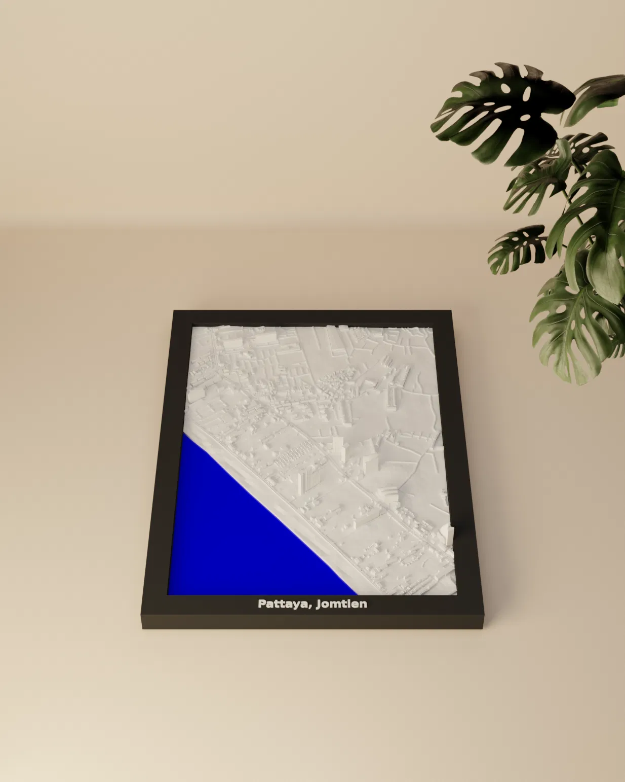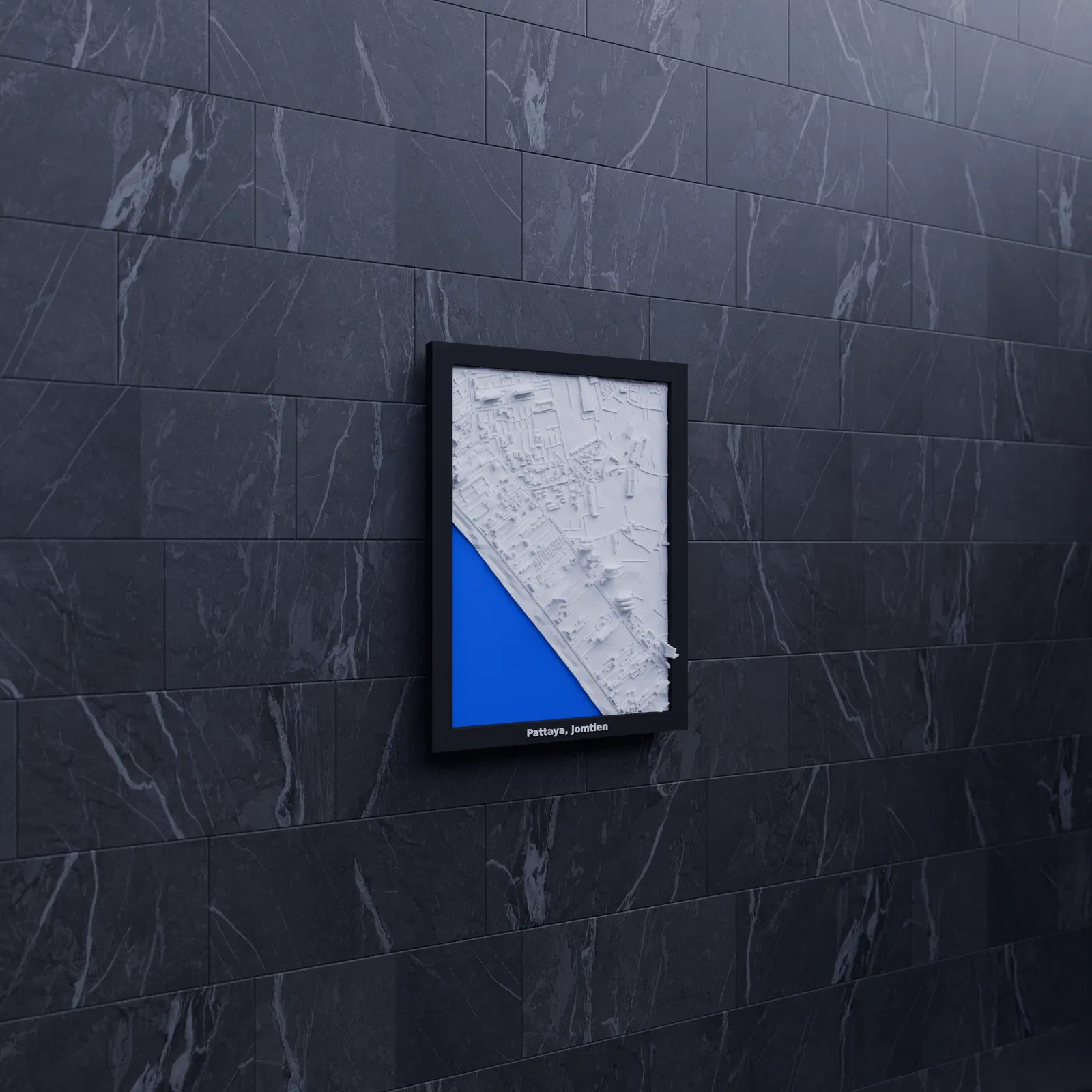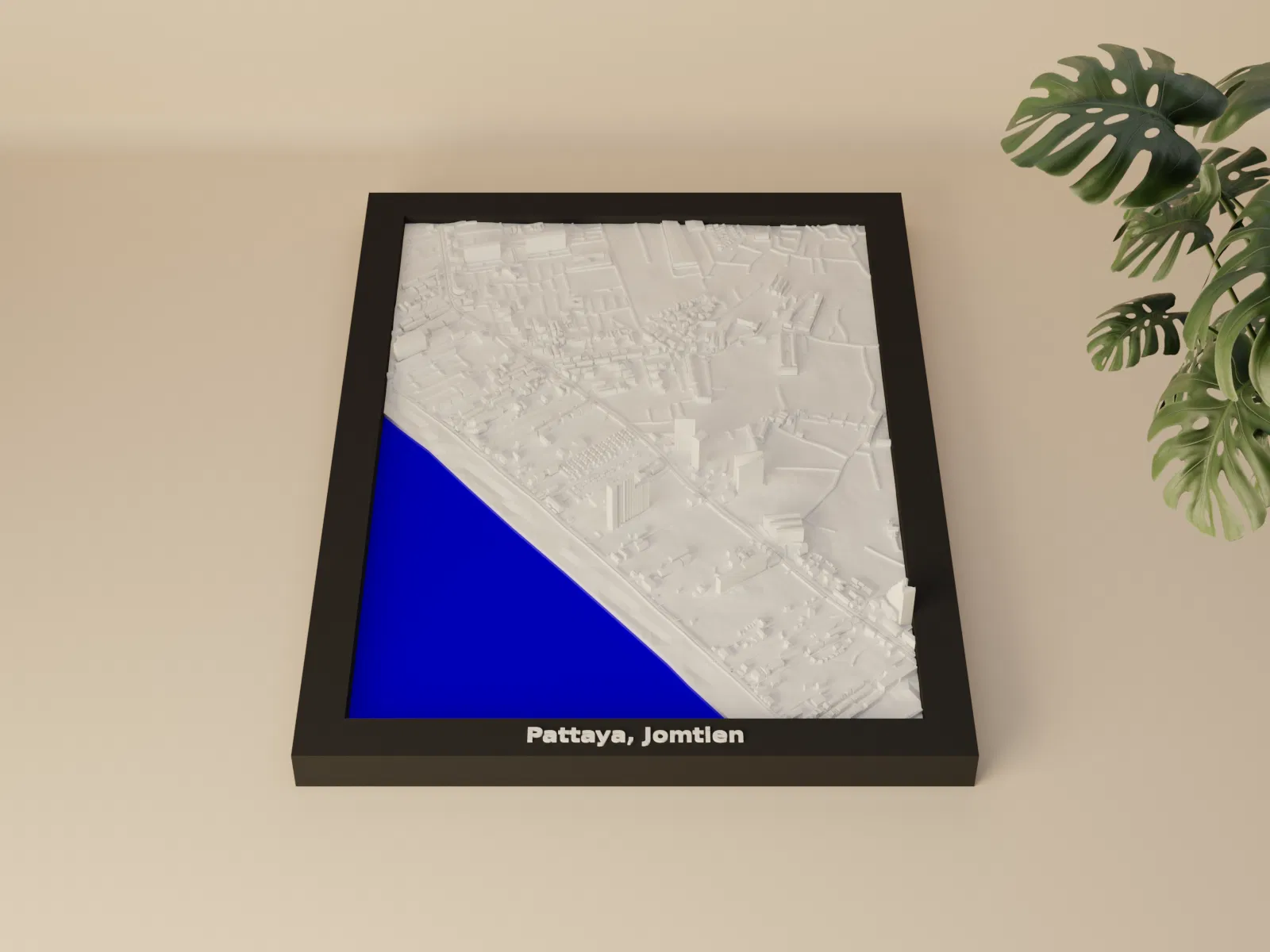 Mô hình topographic 3D thu nhỏ tái hiện khu vực Pattaya, Jomtien (Thái Lan) từ dữ liệu địa lý, kích thước in 119.5×170.5 mm, tỷ lệ ~13045:1. Có sẵn các frame kèm lỗ treo và print profile.