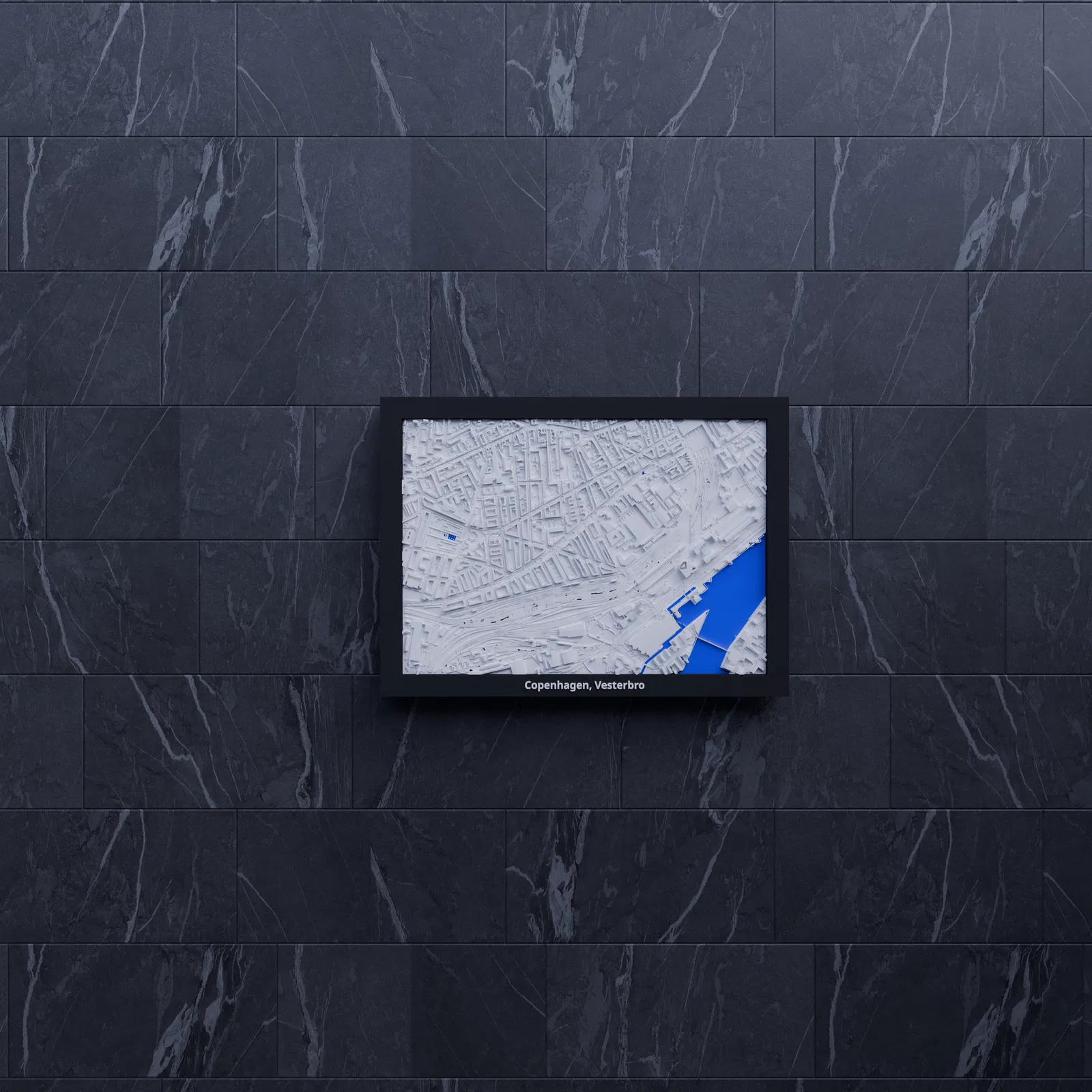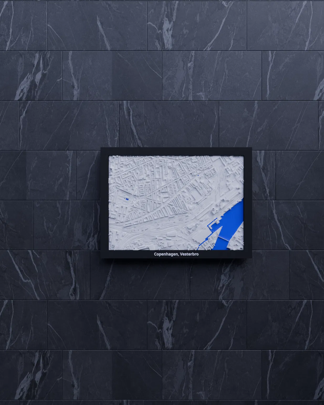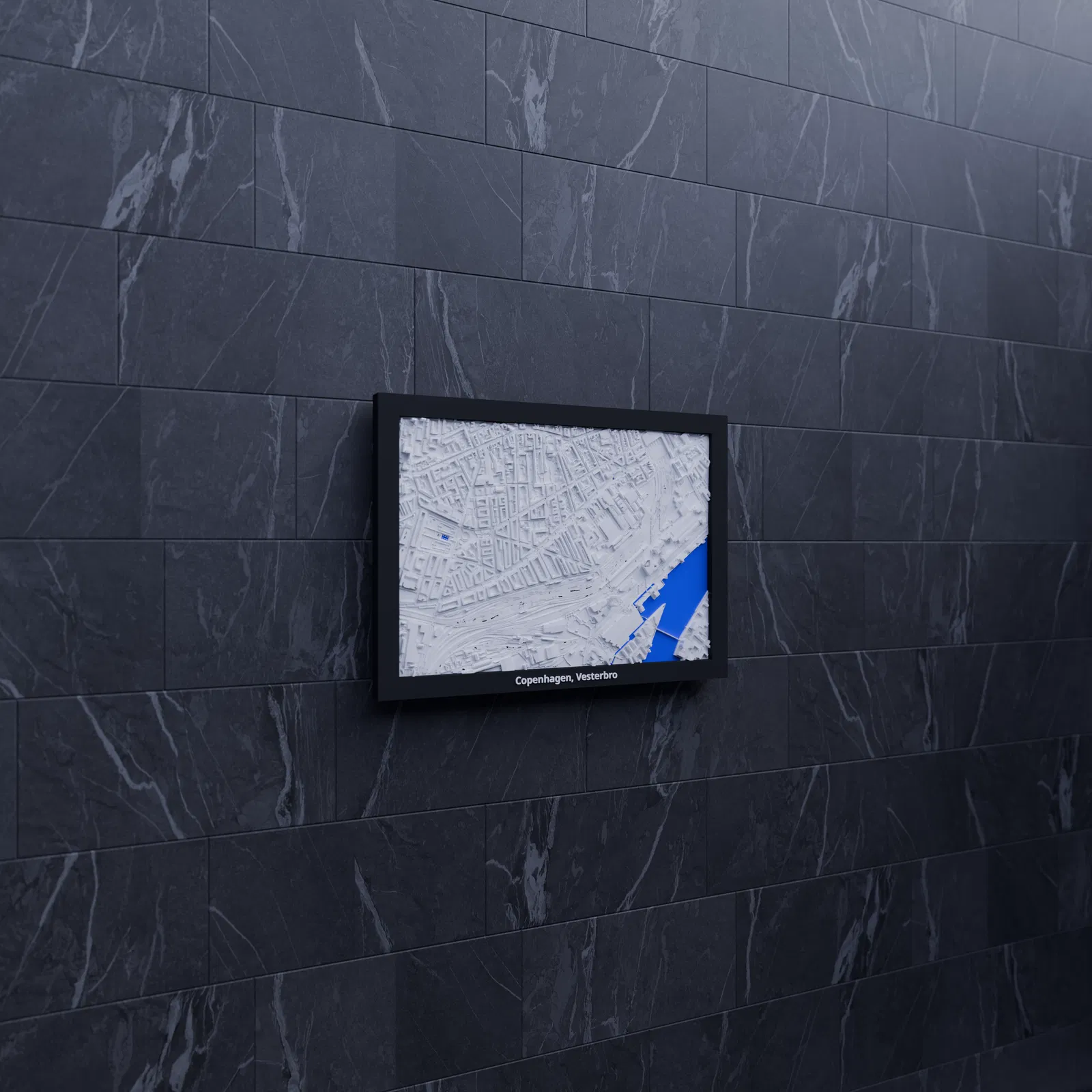 Mô hình mini địa hình (topographic) in 3D khu Copenhagen, Vesterbro, Đan Mạch, dựng từ dữ liệu địa lý. Thu nhỏ từ 2.068 x 1.446 km xuống 170.5 x 119.5 mm, kèm nhiều lựa chọn frame và hướng dẫn lắp ráp.